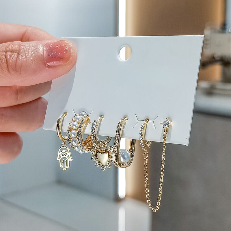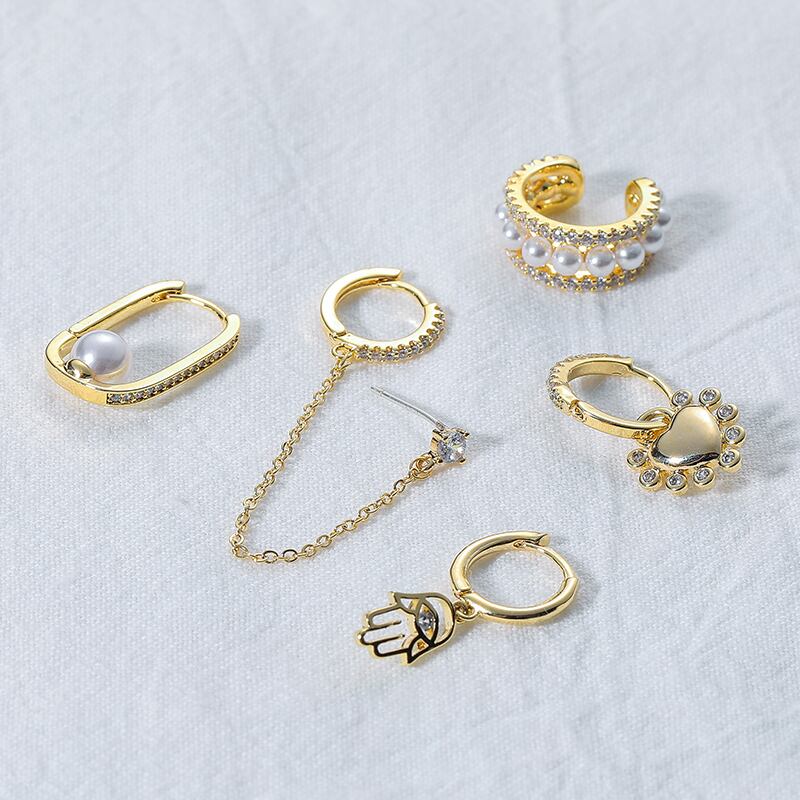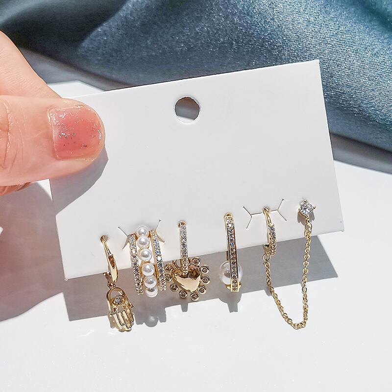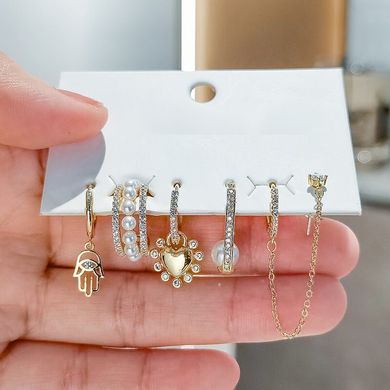 送料無料 ANENJERY6個/セットシルバーカラーパームチェーンハートフープピアスセット手作りクリエイティブジルコンパールピアスパーティージュエリー イヤリング 真珠 リング 指輪 銀 アクセサリー AE165521399050000