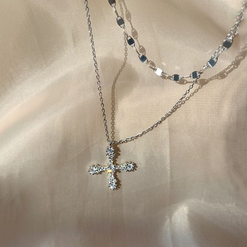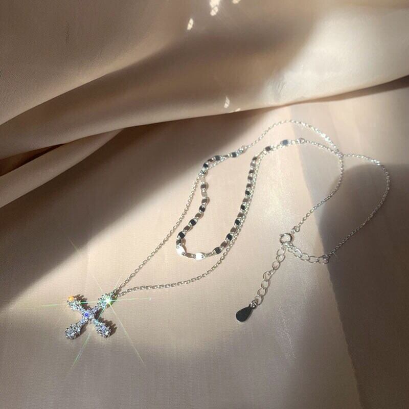 送料無料 ANENJERYシルバーカラーダブルレイヤークロスネックレスレディースシャイニーCZ鎖骨チェーンネックレスジュエリーギフトS-N244 レース 銀 アクセサリー AE165545795400489