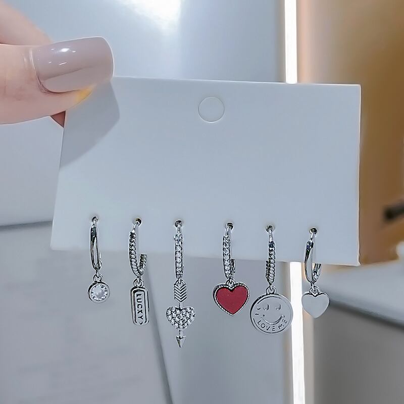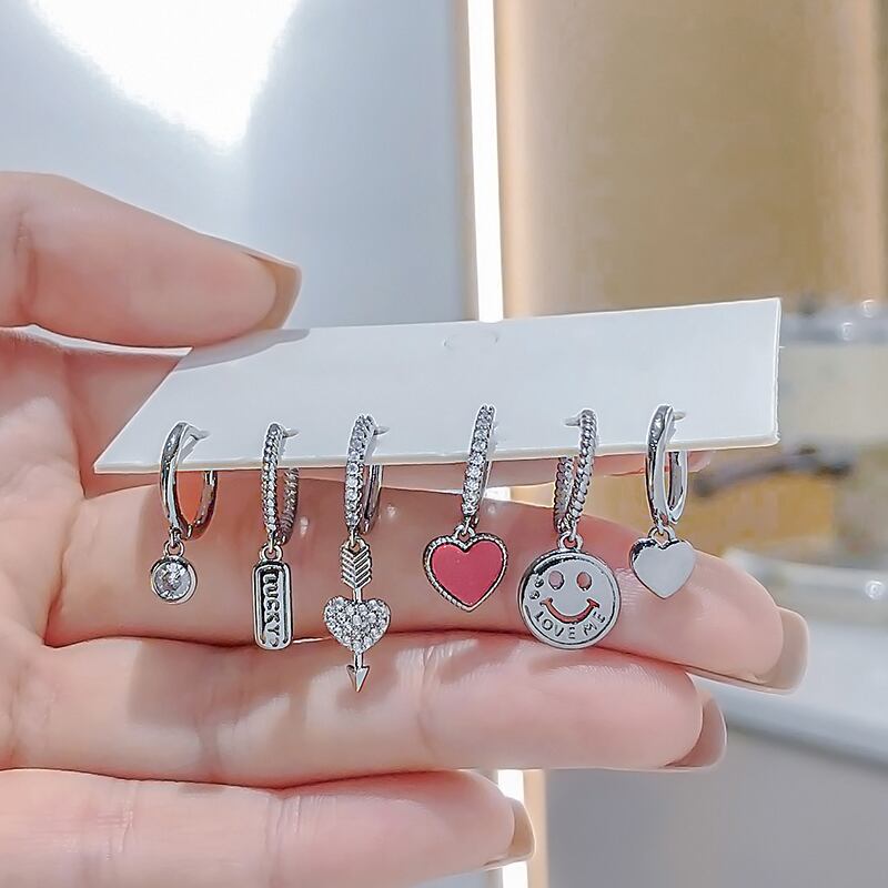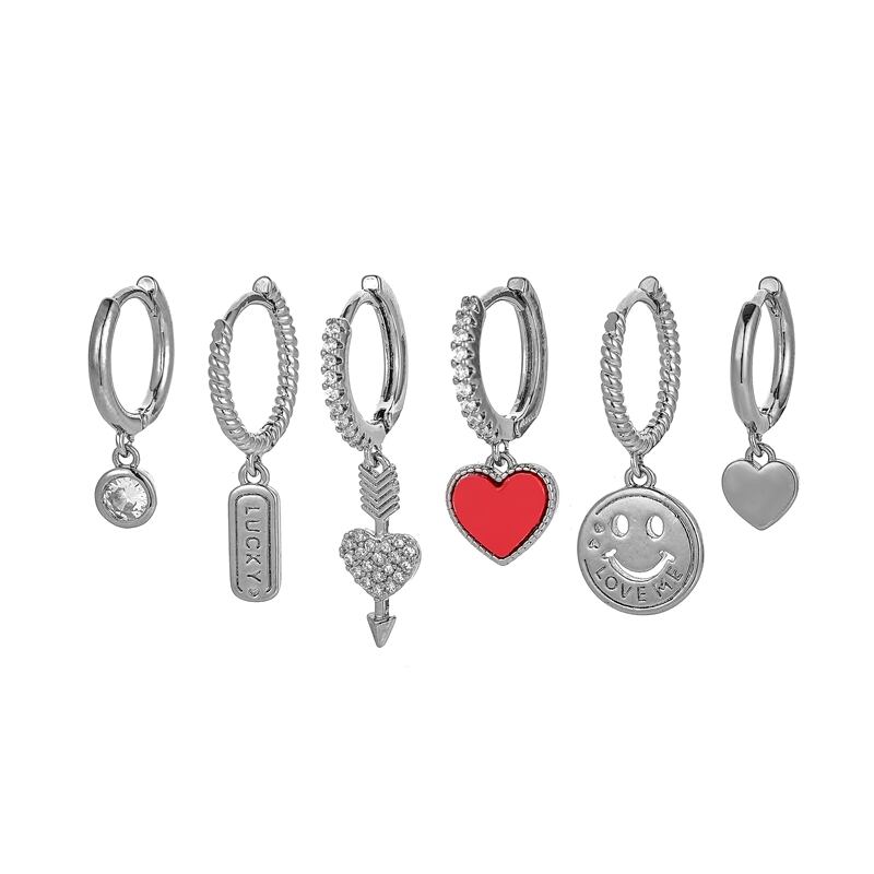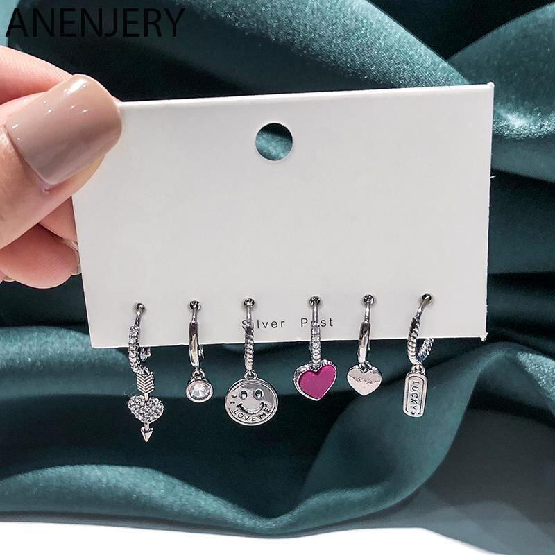 送料無料 ANENJERYシルバーカラー6ピースイヤリングセットスマイリーハートラッキーフープピアスパーソナルパーティージュエリーギフト 指輪 銀 アクセサリー AE165582292768391
