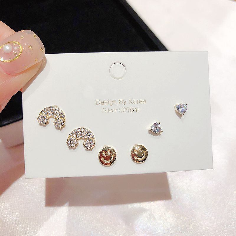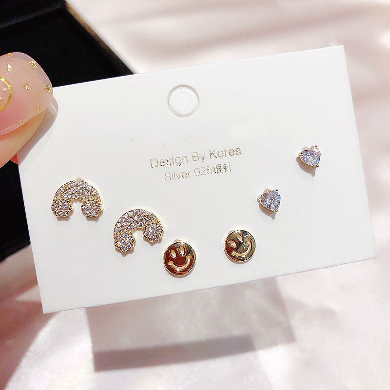 送料無料 ANENJERYクラウドハートスマイルフェイススタッドピアスセットマイクロジルコン6点セット女性用ジュエリーギフト イヤリング リング 指輪 アクセサリー AE165563216075984