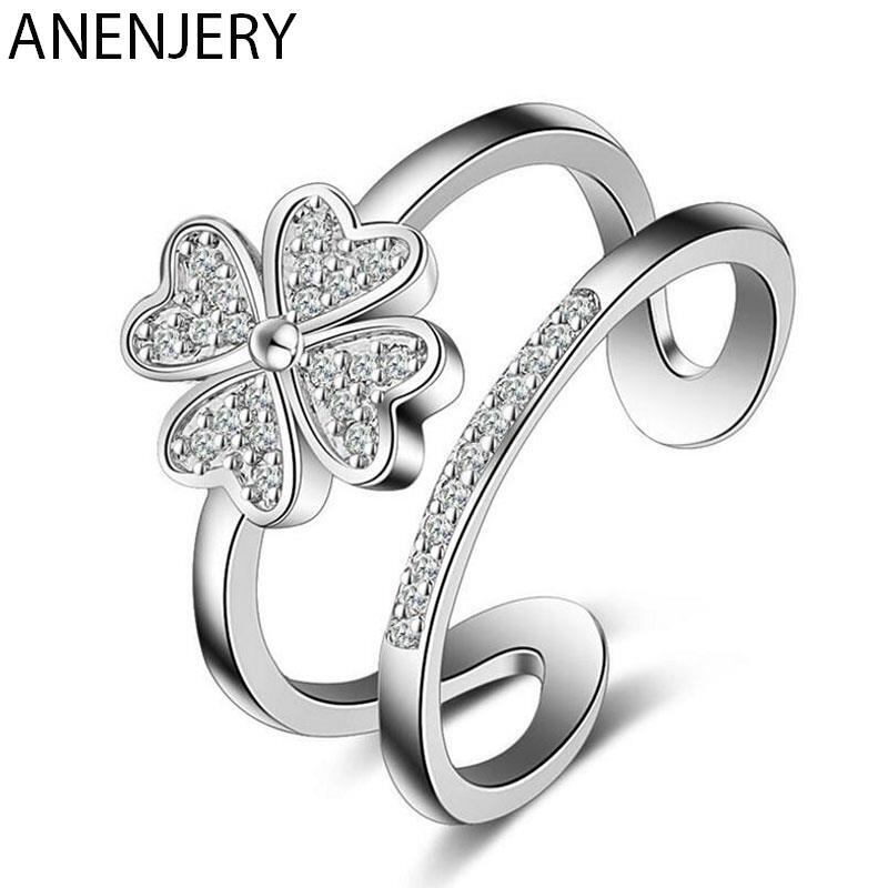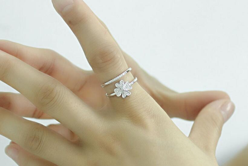 送料無料 ANENJERYシルバーカラーダブルレイヤーハートかわいいラッキー4つ葉のクローバーオープニングリングレディースジュエリー発送S-R193 大人ガーリー スウィート キュート カジュアル 指輪 銀 アクセサリー AE165566882534946