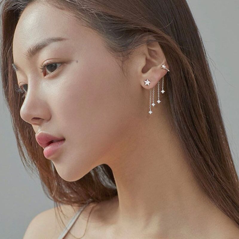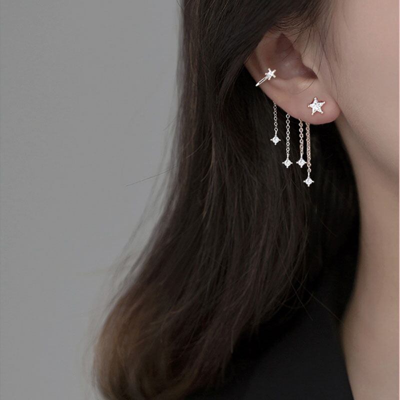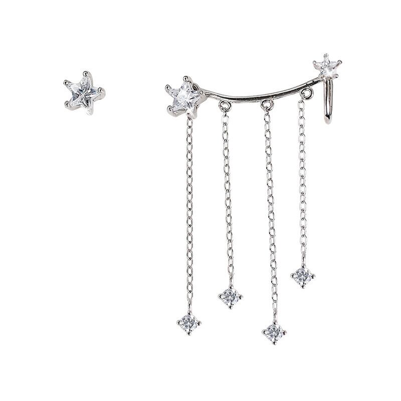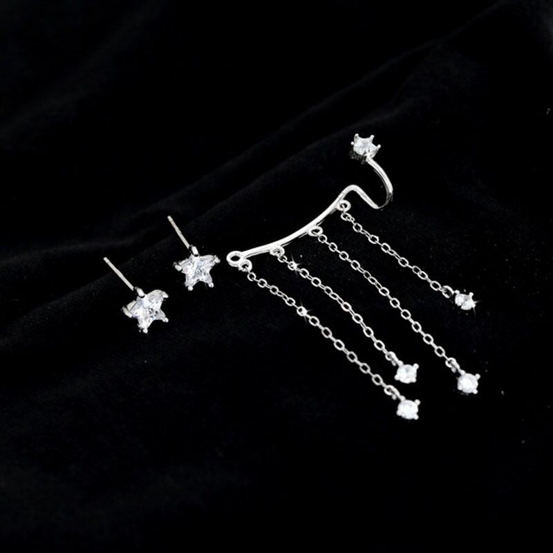 送料無料 ANENJERYシルバーカラー銅ジルコンスターTelチェーン非対称クリップイヤリング女性可憐な天体のイヤリング 指輪 銀 アクセサリー AE165521938777354