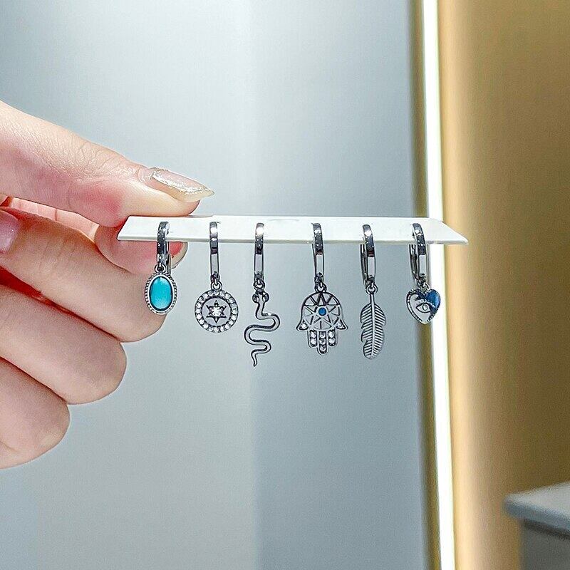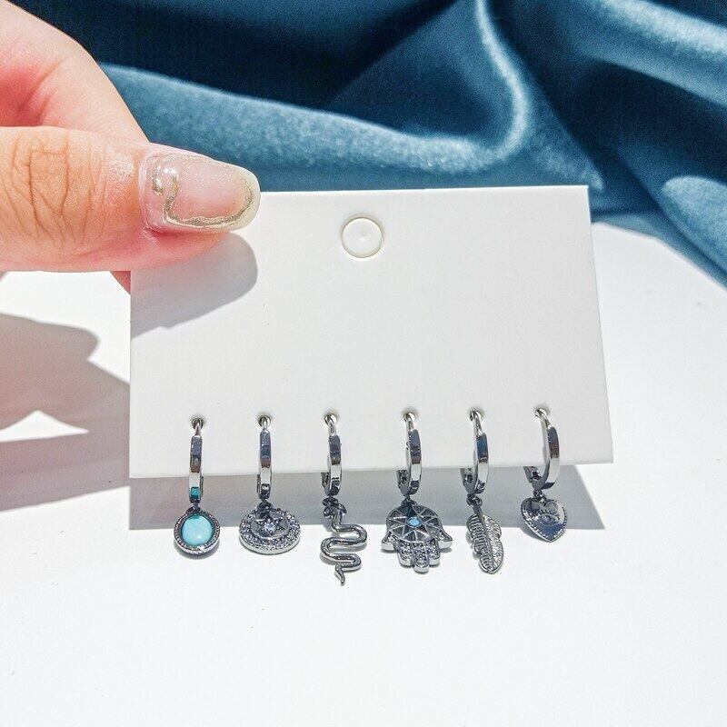 送料無料 ANENJERYシルバーカラーカッパージルコンスネークフェザーラブハートブラックイヤリングレディースボヘミアンレトロ6ピースピアスセット 指輪 銀 アクセサリー AE165516704872600