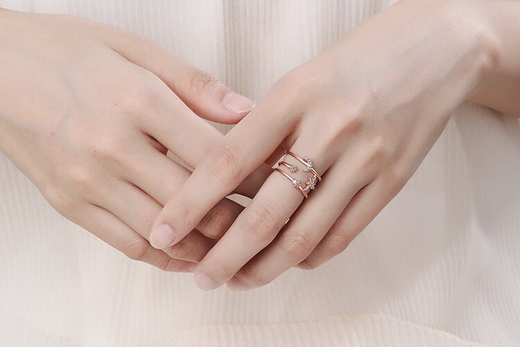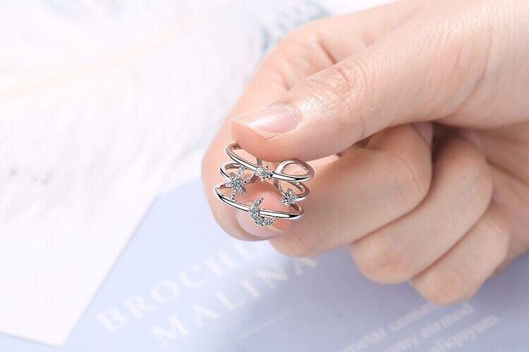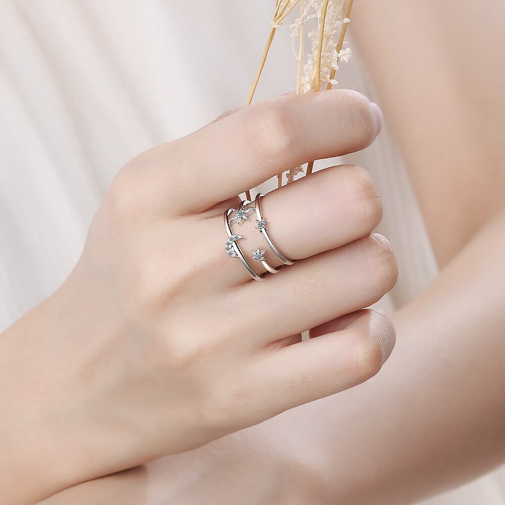 送料無料 ANENJERYシルバーカラーマルチレイヤームーンスター眩しいジルコンオープンリングジュエリーバースデーギフトS-R464 レッド 指輪 銀 アクセサリー AE16552302167784