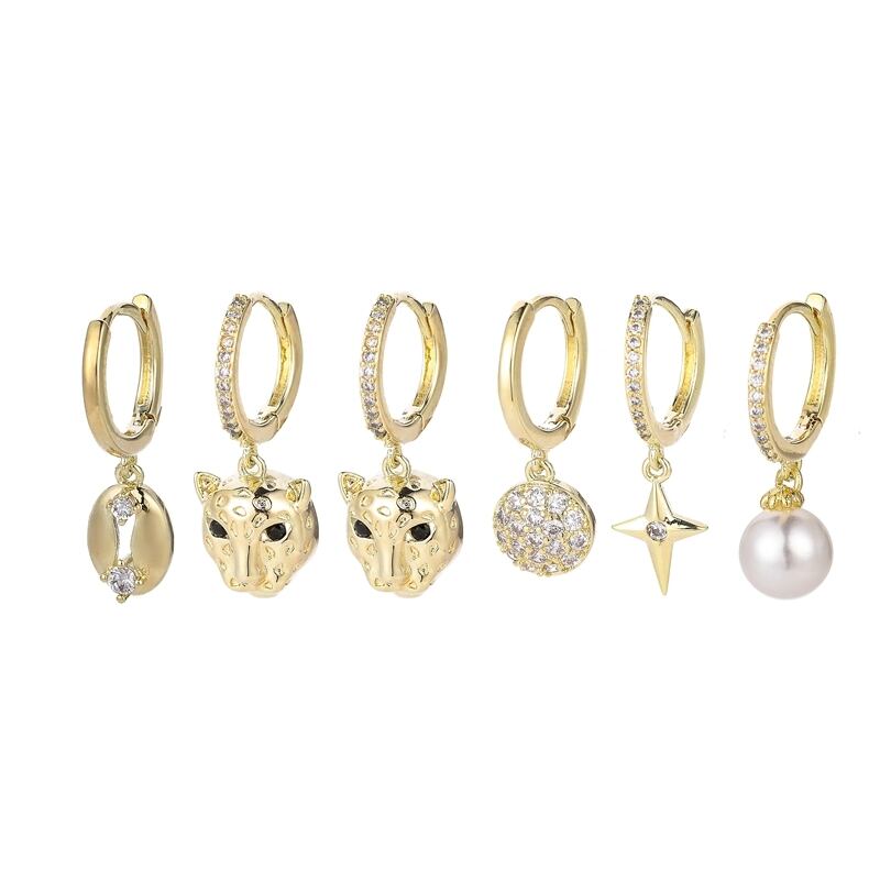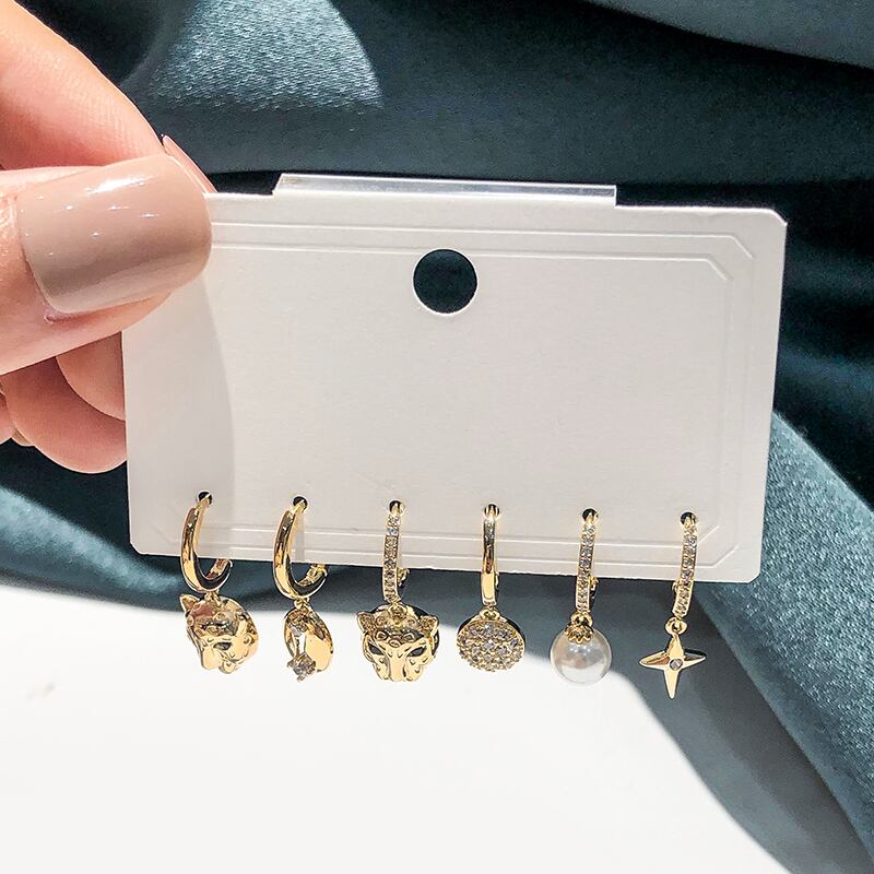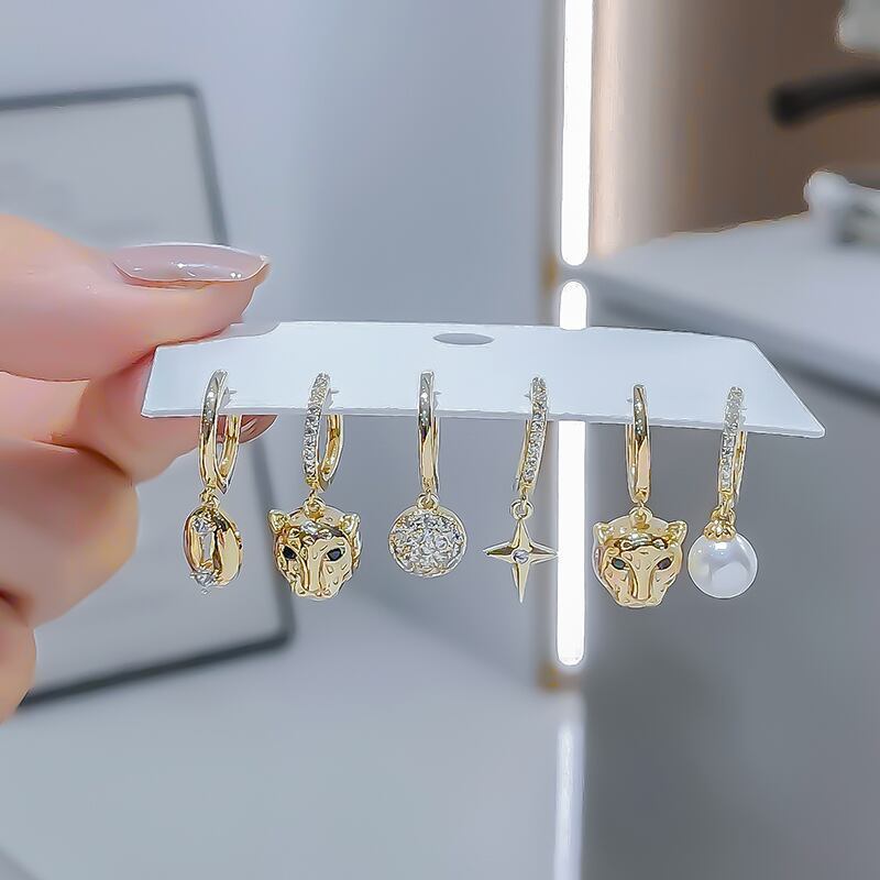 送料無料 ANENJERYシルバーカラー6ピースイヤリングセットマイクロジルコンレオパードヘッドパールボールフープピアスライトラグジュアリーパーティージュエリー 真珠 指輪 銀 アクセサリー AE165595870995432