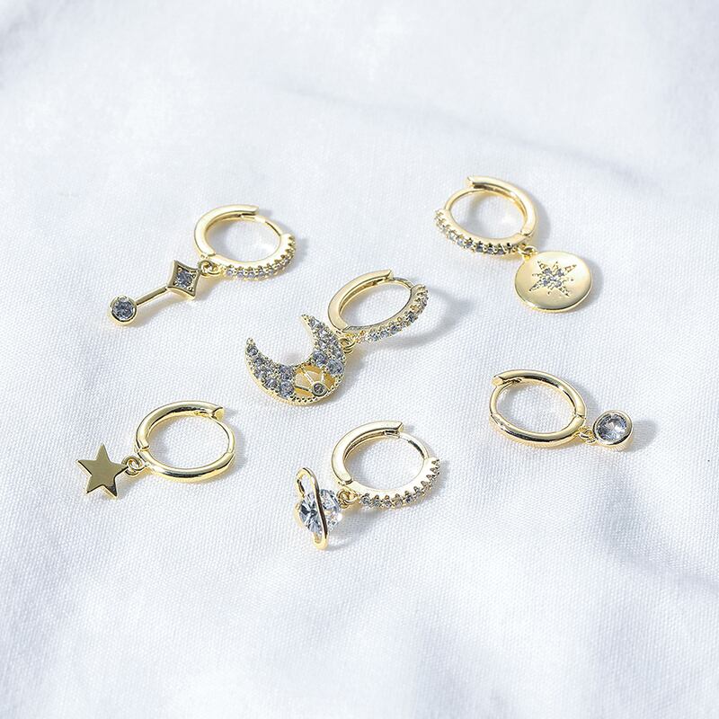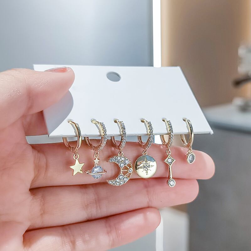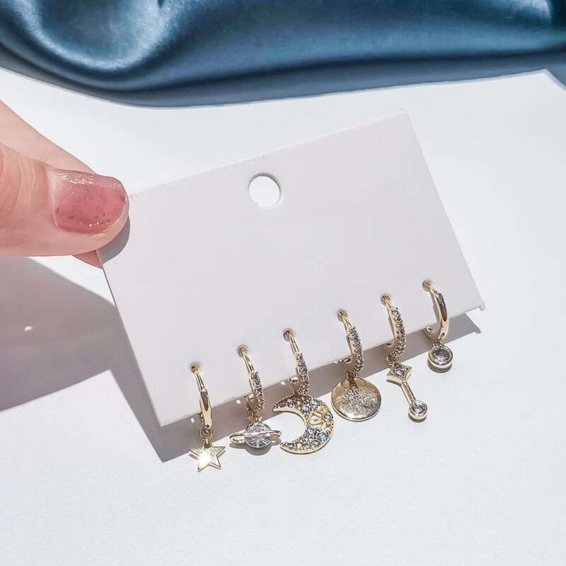 送料無料 ANENJERY6個/セットシルバーカラープラネットムーンスターフープピアス女性絶妙なロマンティックマイクロジルコンスターリースカイピアス イヤリング リング 指輪 銀 アクセサリー AE165557981420812