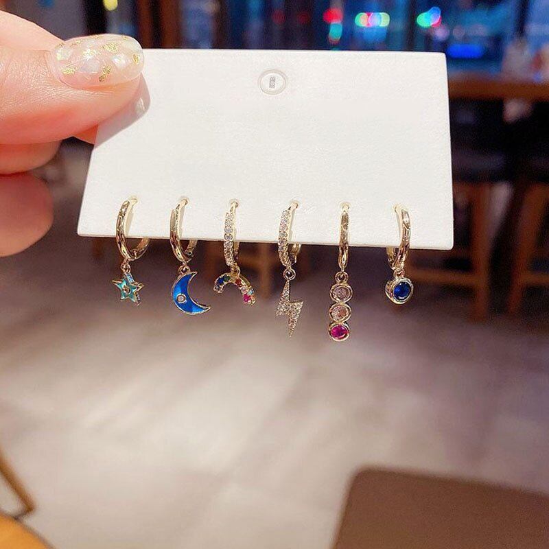 送料無料 ANENJERYシルバーカラームーンスターフープピアスレディースカラージルコン6点ピアスセット レッド イヤリング リング 指輪 銀 アクセサリー AE165555990554280