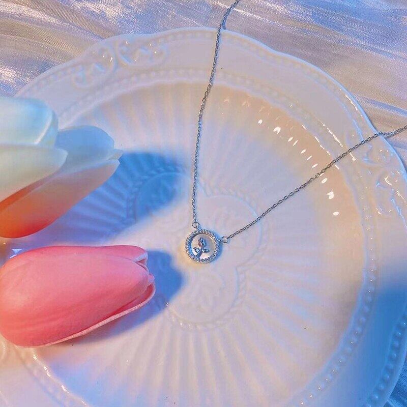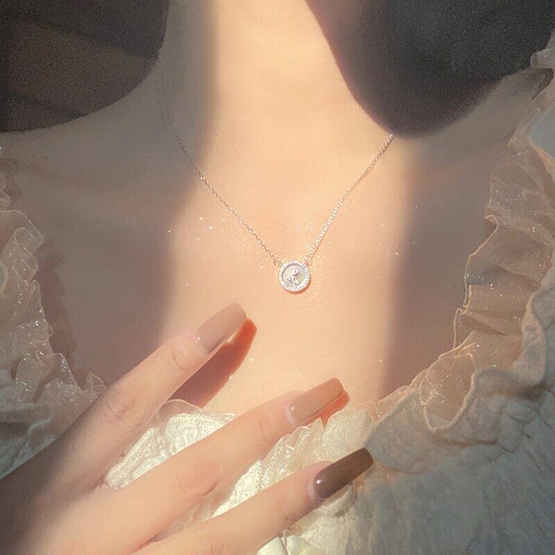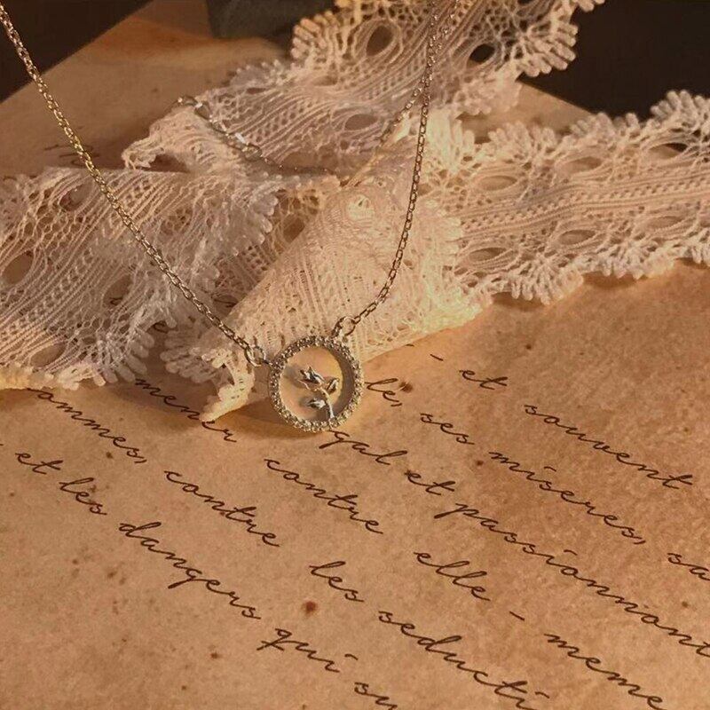 送料無料 ANENJERYシルバーカラー銅ジルコンラウンドシェルローズフラワーネックレス女性ライトラグジュアリーレトロクラビクルチェーンジュエリー レース フラワーデザイン 銀 アクセサリー AE1655855864388