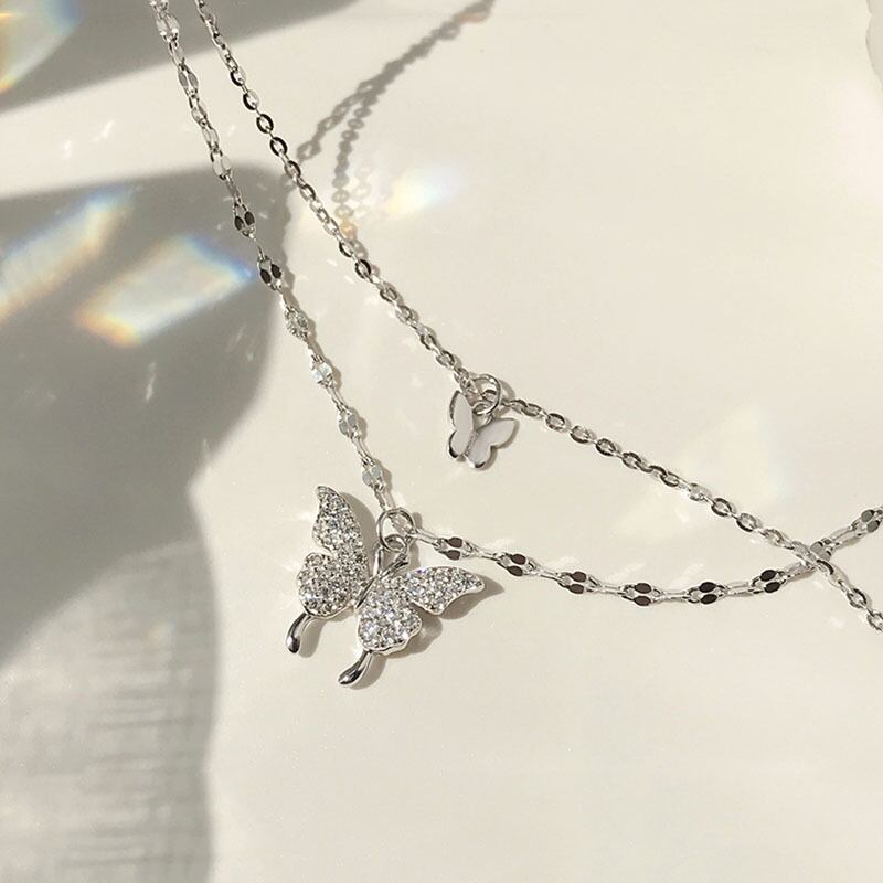 送料無料 ANENJERYシルバーカラーシャイニーバタフライネックレスレディースダブルレイヤー鎖骨シャイニーチェーンネックレスジュエリーS-N173 レース 銀 アクセサリー AE165544487891844