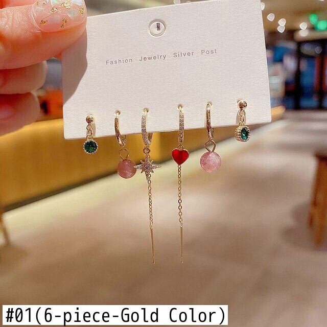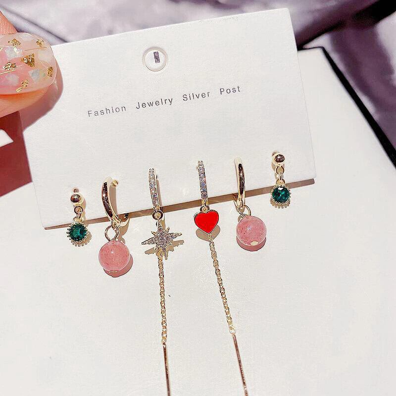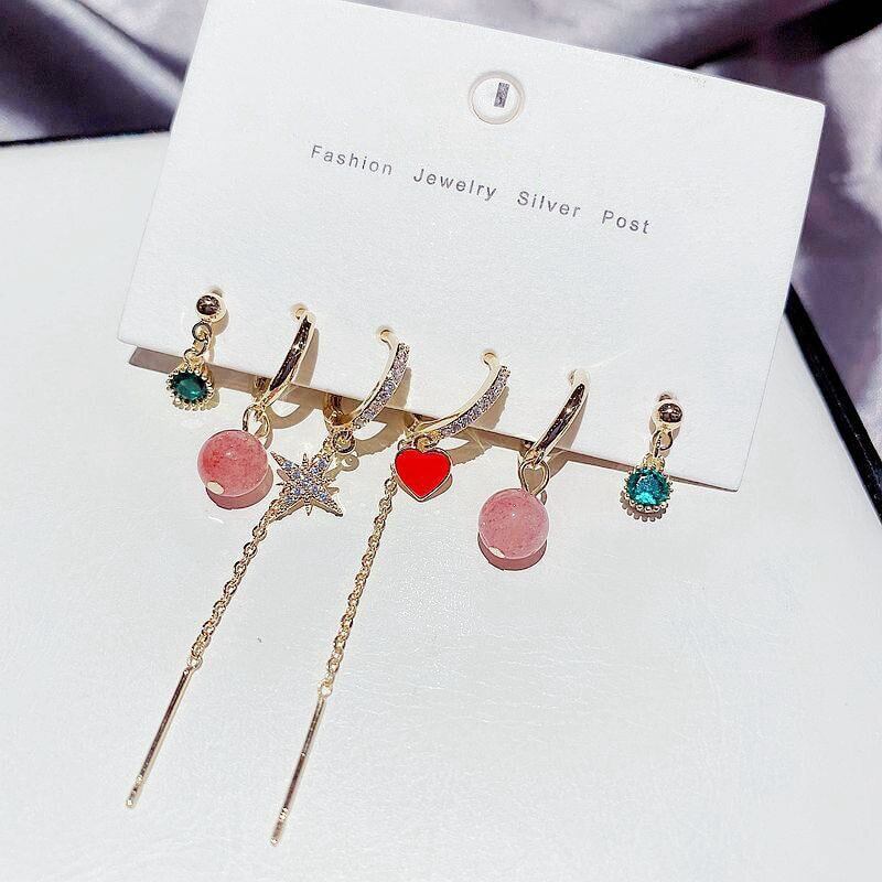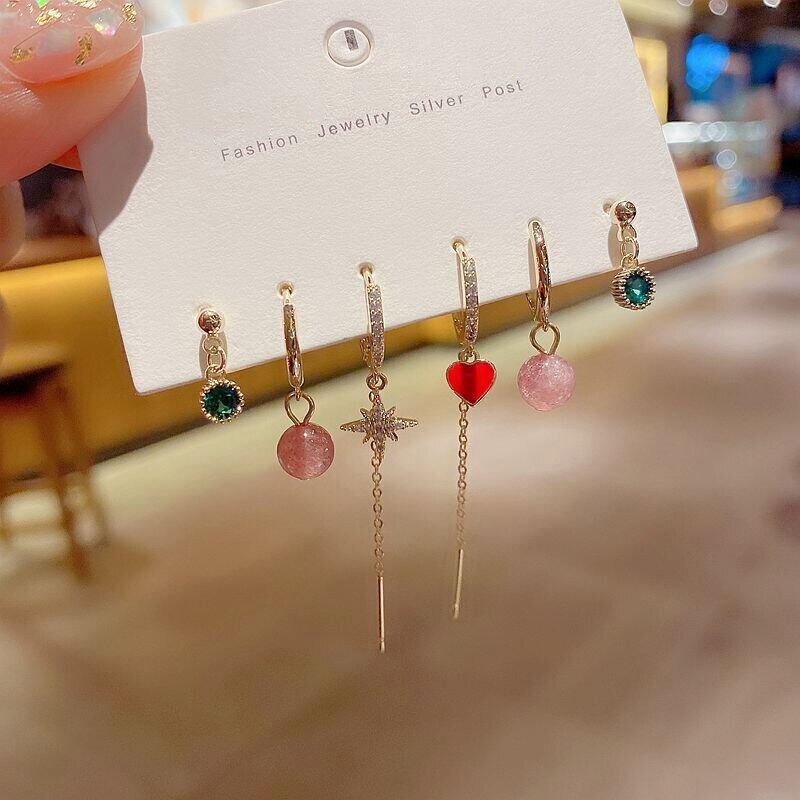 送料無料 ANENJERY6点セットストロベリークリスタルビーズフープピアスセットレディースロングチェーンゴールドカラースターハートピアスギフトS-E1288 イヤリング リング 指輪 アクセサリー AE165561840001503