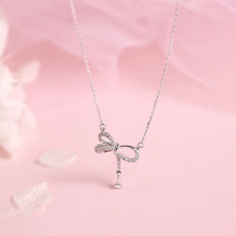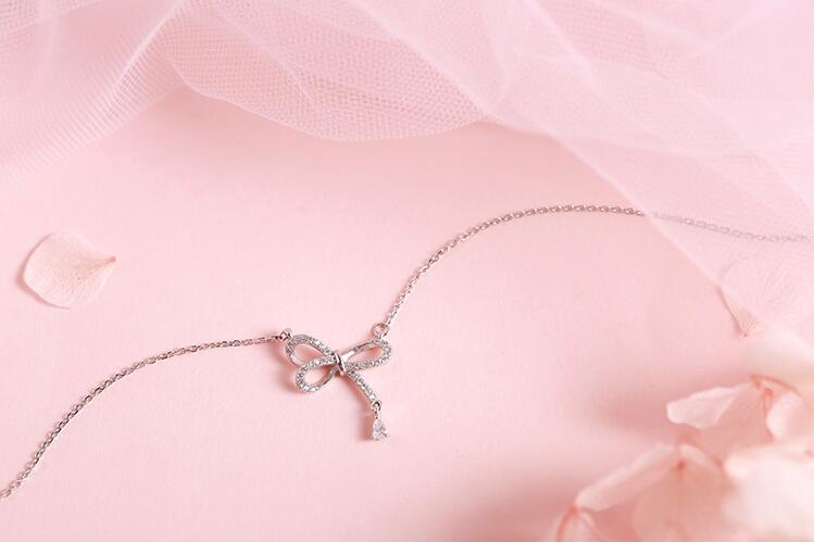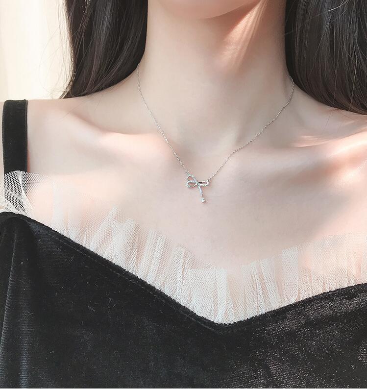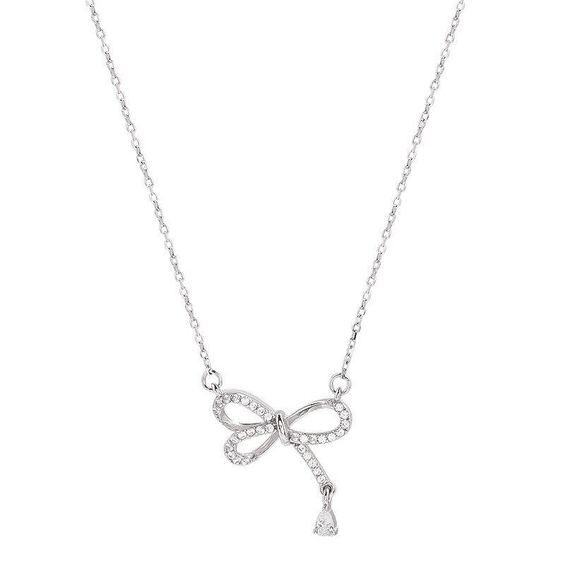 送料無料 ANENJERYシルバーカラー絶妙なボウノットジルコンペンダントネックレス鎖骨チェーンパーティージュエリー女性女の子配送S-N458 リボン レース 銀 アクセサリー AE165529170855389