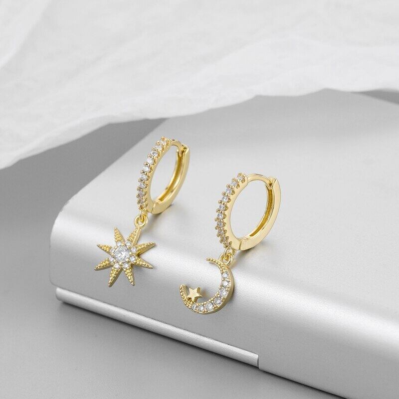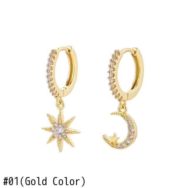 送料無料 ANENJERYシルバーカラームーンスター非対称フープピアスマイクロ象眼細工ジルコンピアスジュエリーレディースギフトS-E1130 イヤリング 銀 アクセサリー AE16552716601837