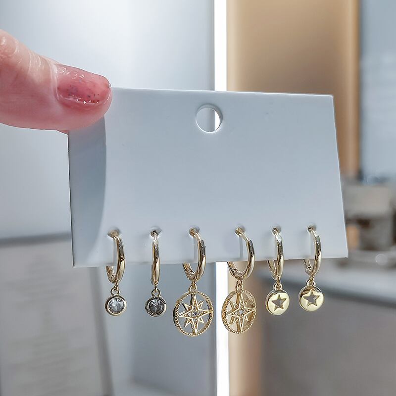 送料無料 ANENJERY6個/セットシルバーカラーディスクスターフープピアスセット3ペアレトロホットイヤリングパーティージュエリー 指輪 銀 アクセサリー AE165573923514008