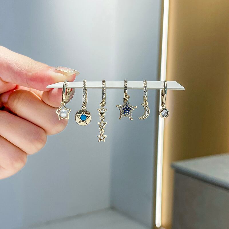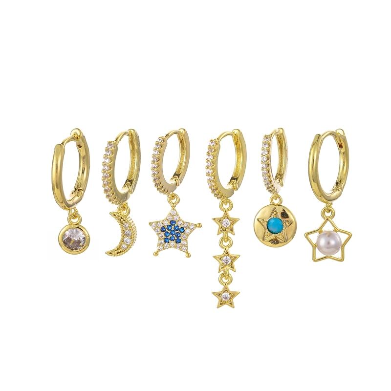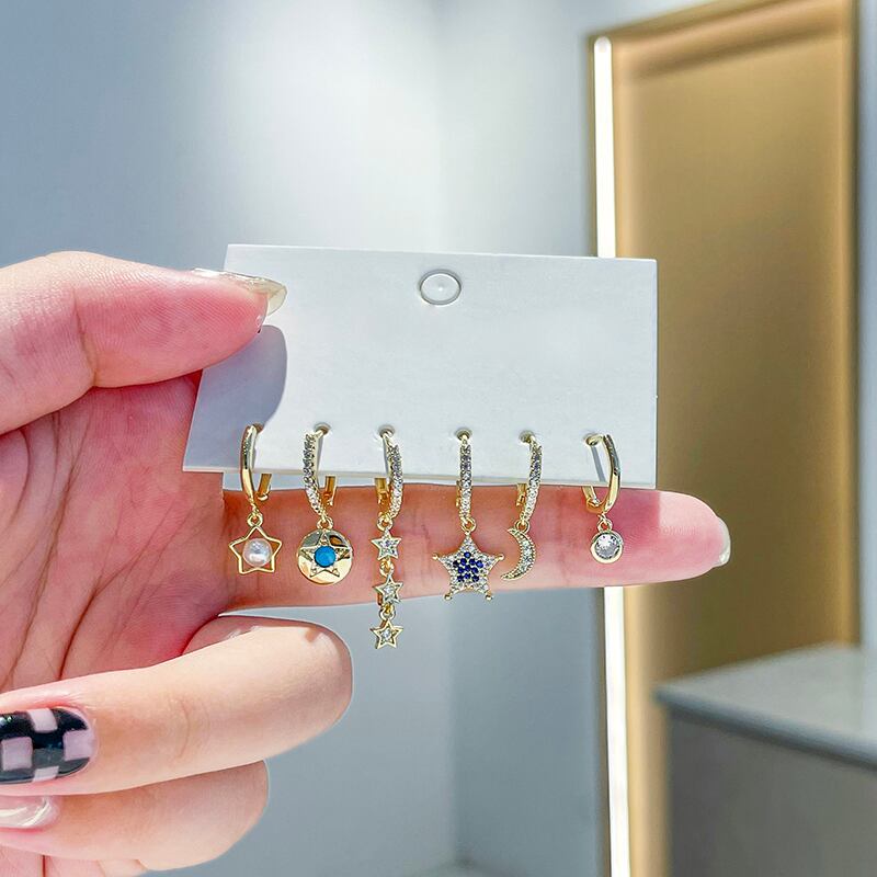 送料無料 ANENJERYシルバーカラージルコンムーンスターフープピアスレディースライトラグジュアリーゴールデン6ピースピアスセット イヤリング リング 指輪 銀 アクセサリー AE165517222144003