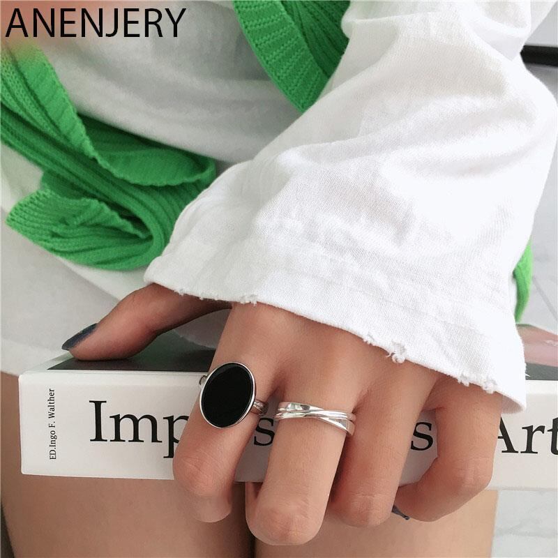 送料無料 ANENJERYシルバーカラージュエリーブラックグレーズオーバルシェイプオープンリングウィメンズパーティージオメトリックギフトS-R696 指輪 銀 アクセサリー AE165510808022408