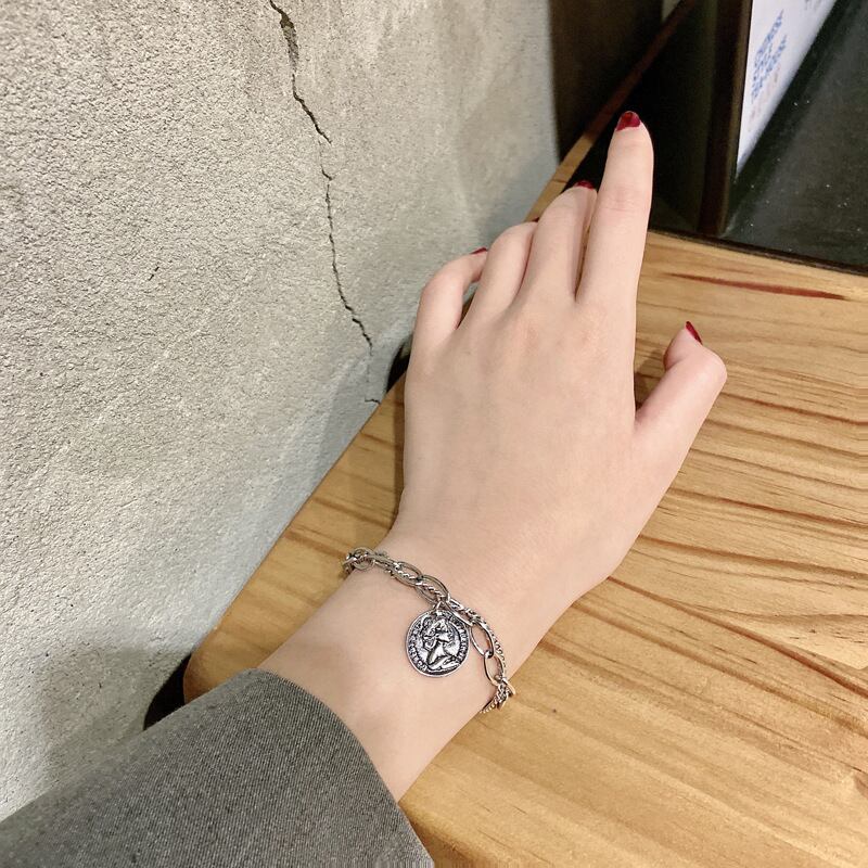 送料無料 ANENJERYシルバーカラーラウンドコインブレスレット女性男性太いチェーンタイシルバーブレスレットギフト 銀 アクセサリー AE165591721310357
