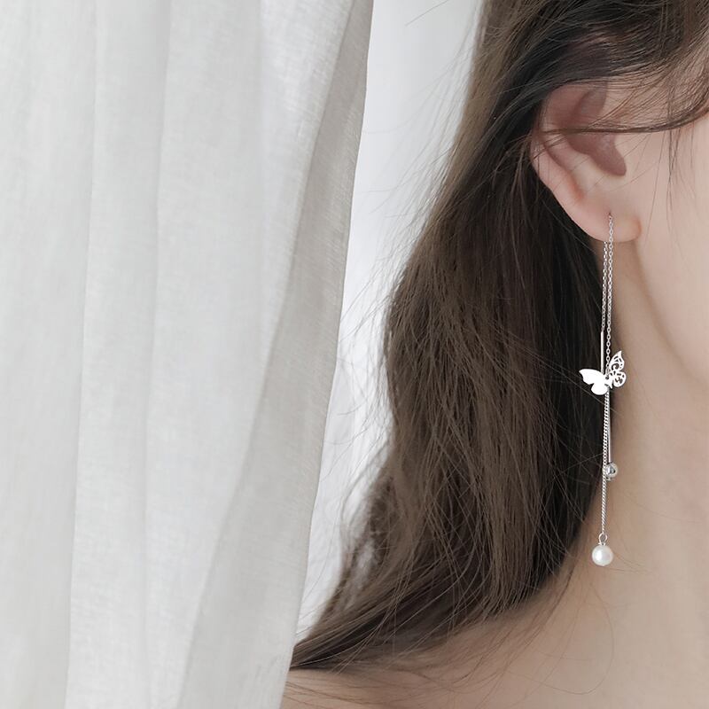 送料無料 ANENJERYシルバーカラーバタフライパールロングテルイヤリングレディースビーズイヤーラインパーティージュエリーギフトS-E1247 真珠 指輪 銀 アクセサリー AE165582411187039