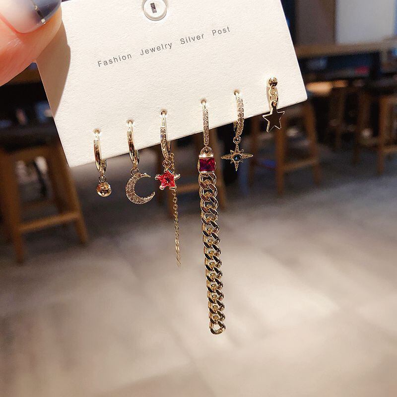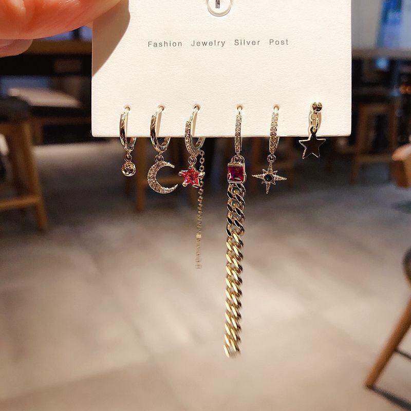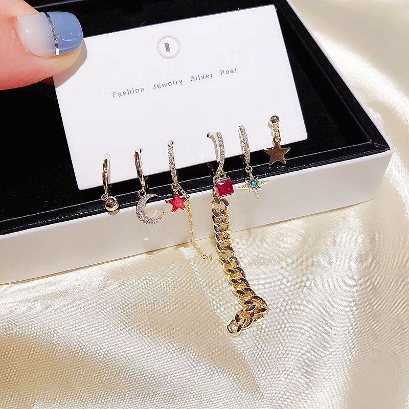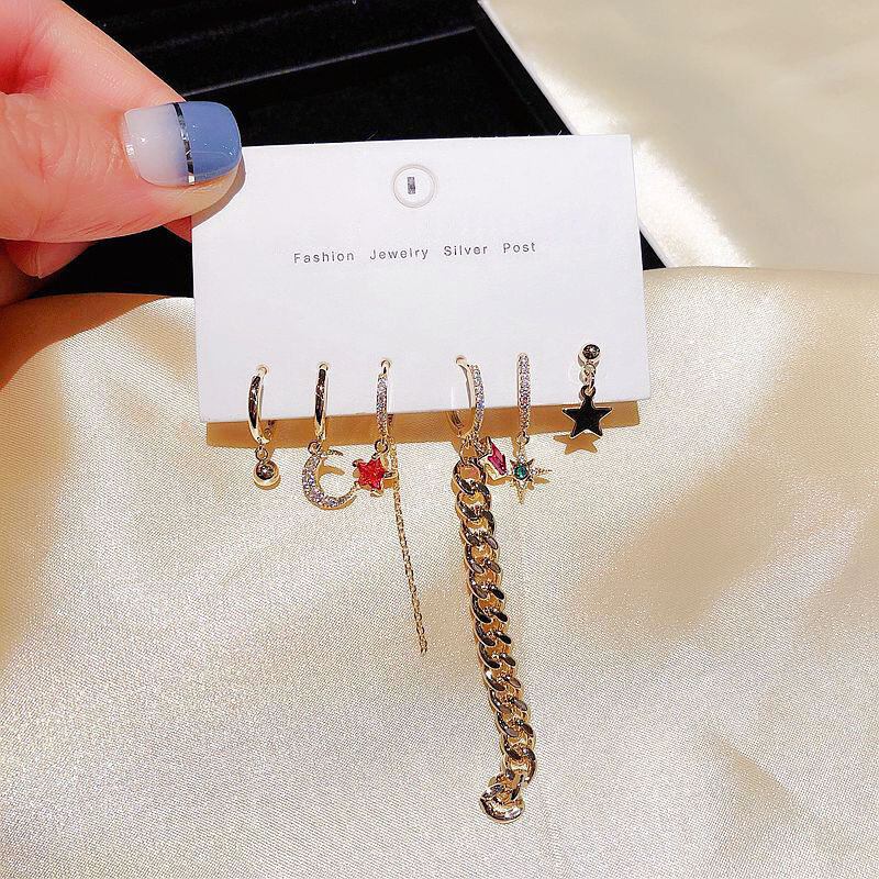 送料無料 ANENJERY誇張ロックチェーンムーンスターフープピアスセットシャイニーマイクロパヴェジルコンピアス6点セットレディースS-E1200 イヤリング リング 指輪 アクセサリー AE165537704811980