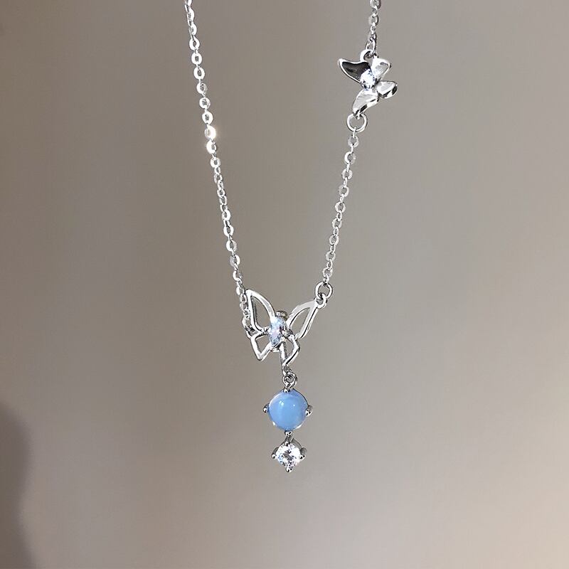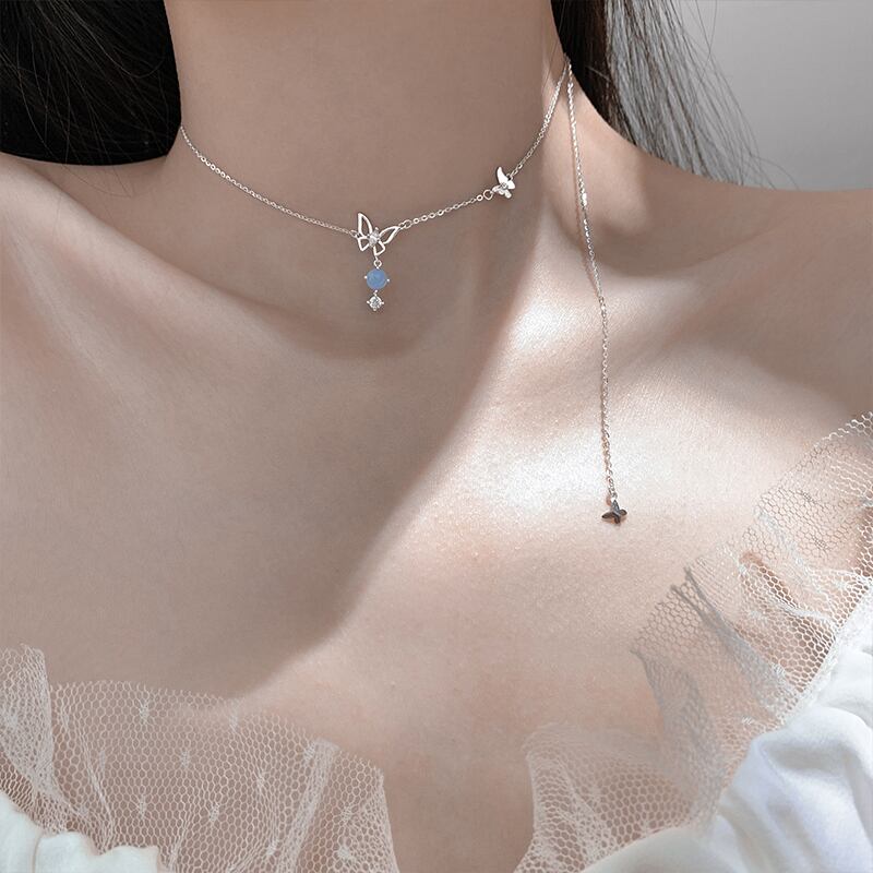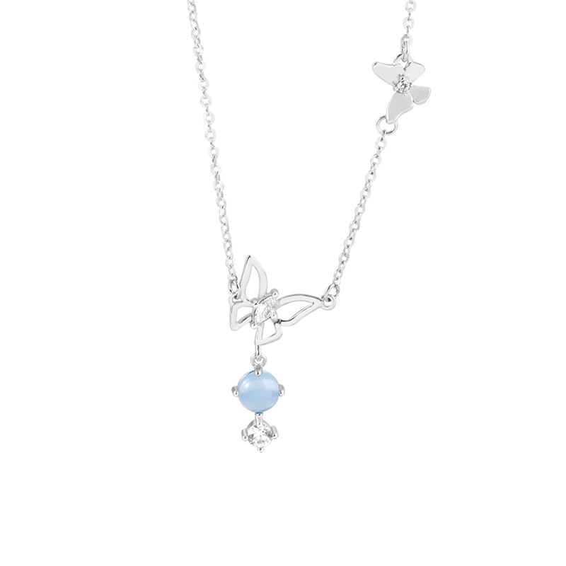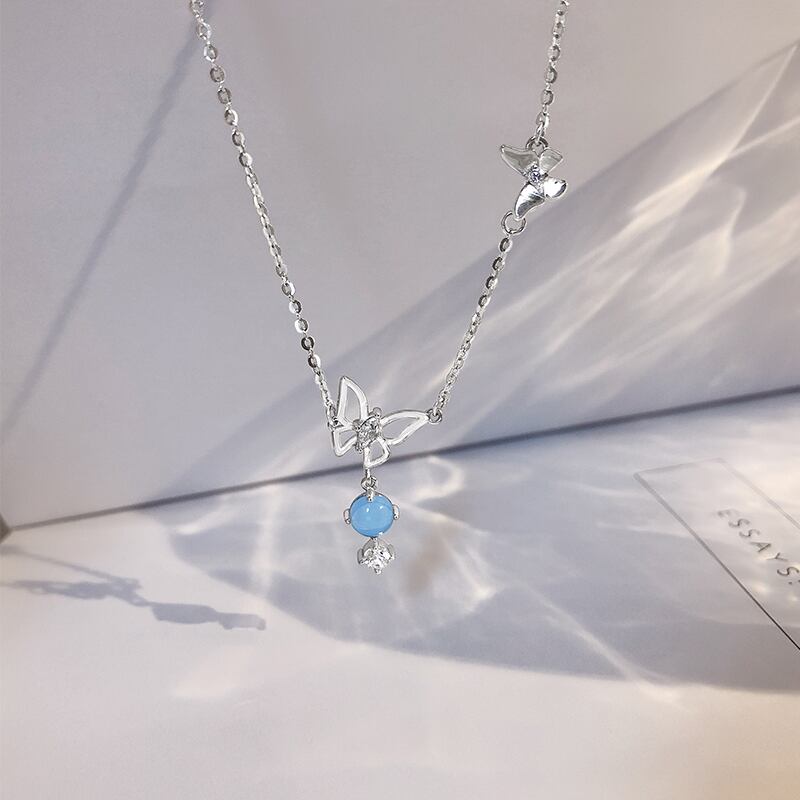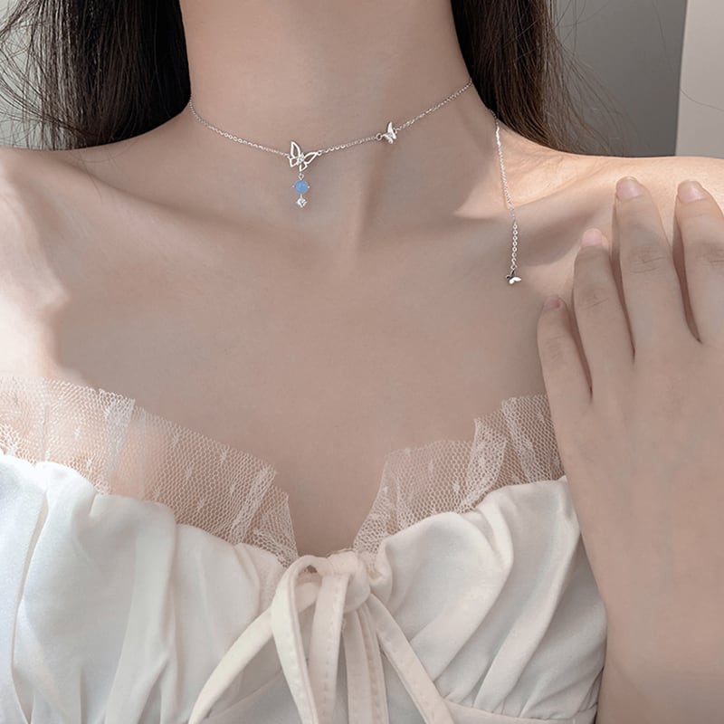 送料無料 ANENJERYシルバーカラーホロウバタフライペンダントネックレスレディースシルバーブルーストーンチョーカーネックレスウェディングジュエリーS-N718 レース 銀 アクセサリー AE165555483352258