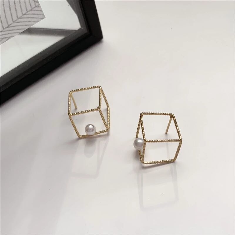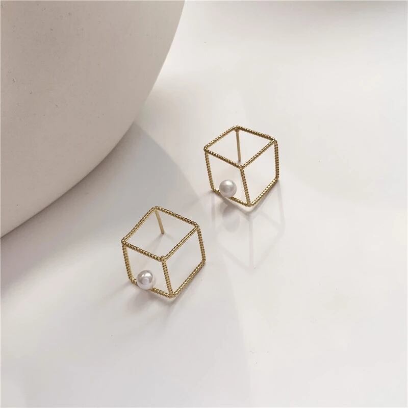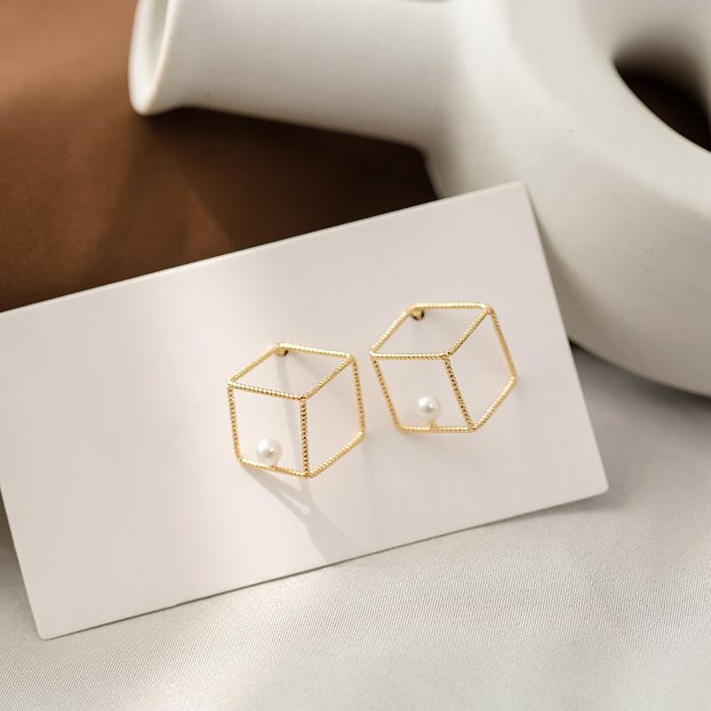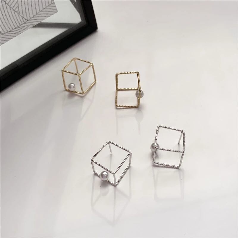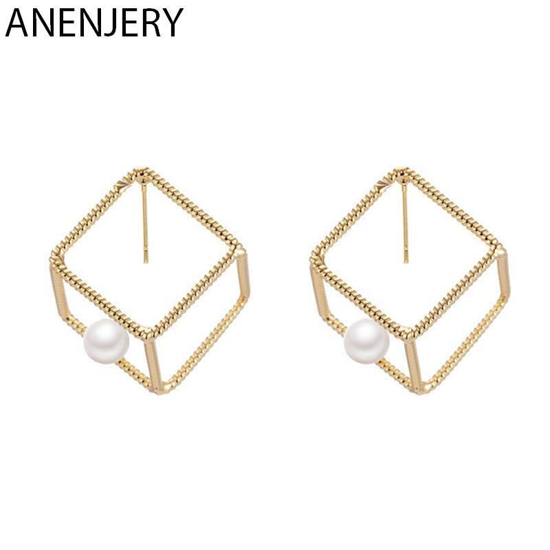 送料無料 ANENJERYシルバーカラーホロウキューブパールスタッドピアスレディースゴールド幾何学的な耳のウェディングイヤリングパーティージュエリーS-E1335 真珠 指輪 銀 アクセサリー AE165563561119175