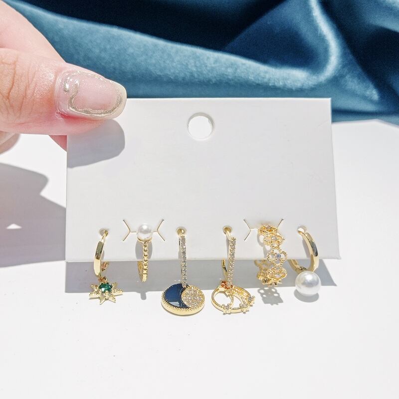 送料無料 ANENJERY6ピースシルバーカラー銅ジルコンムーンスターペンダントフープイヤリングセット女性クリエイティブパールクリップパーティージュエリー 真珠 銀 アクセサリー AE165563205117992