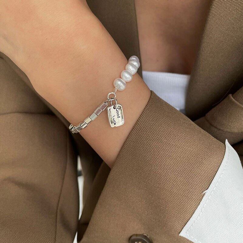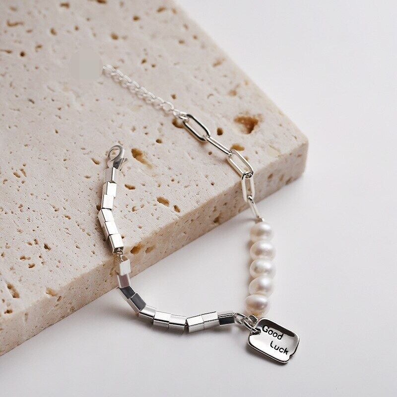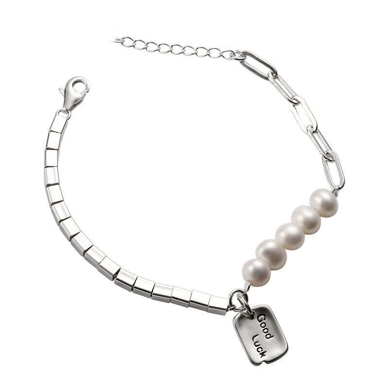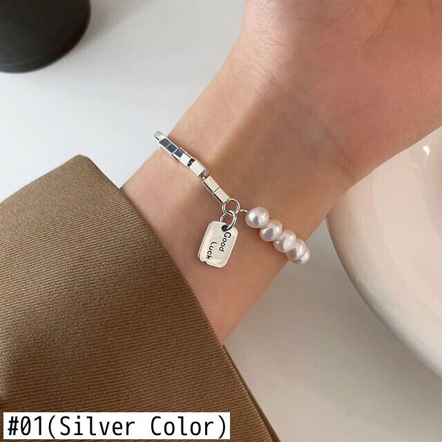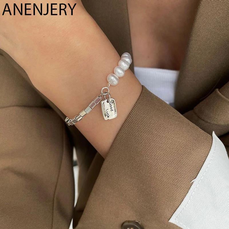 送料無料 ANENJERYシルバーカラー非対称チェーン幾何学的なブレスレットスクエアグッドラックパールブレスレット女性のジュエリー 真珠 銀 スクウェア アクセサリー AE165596366230520