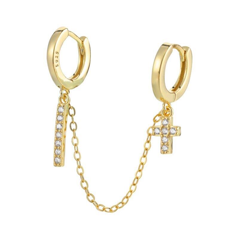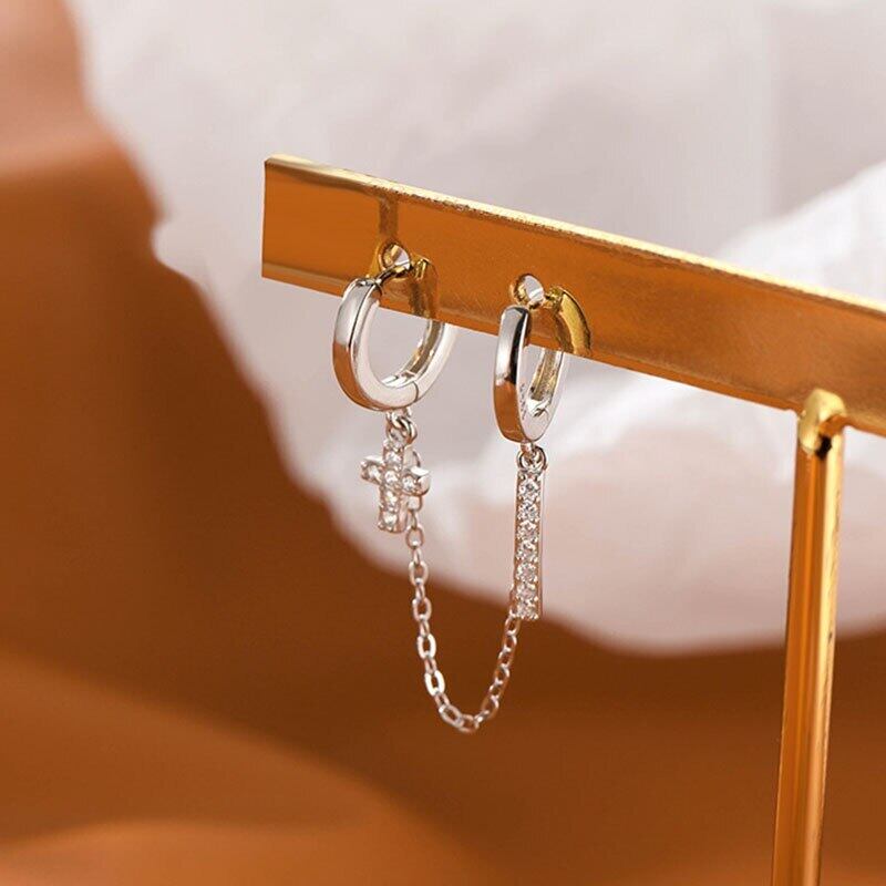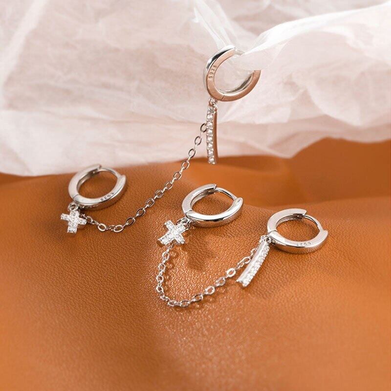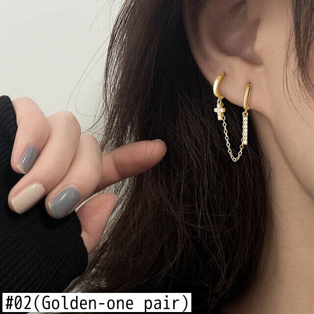 送料無料 ANENJERYシルバーカラーダブルピアスフープピアスレディースクリックジルコンクロスバーピアス イヤリング リング 指輪 銀 アクセサリー AE16557478083438