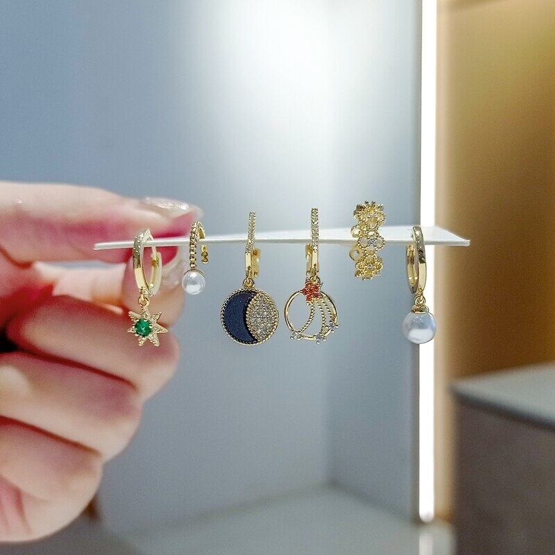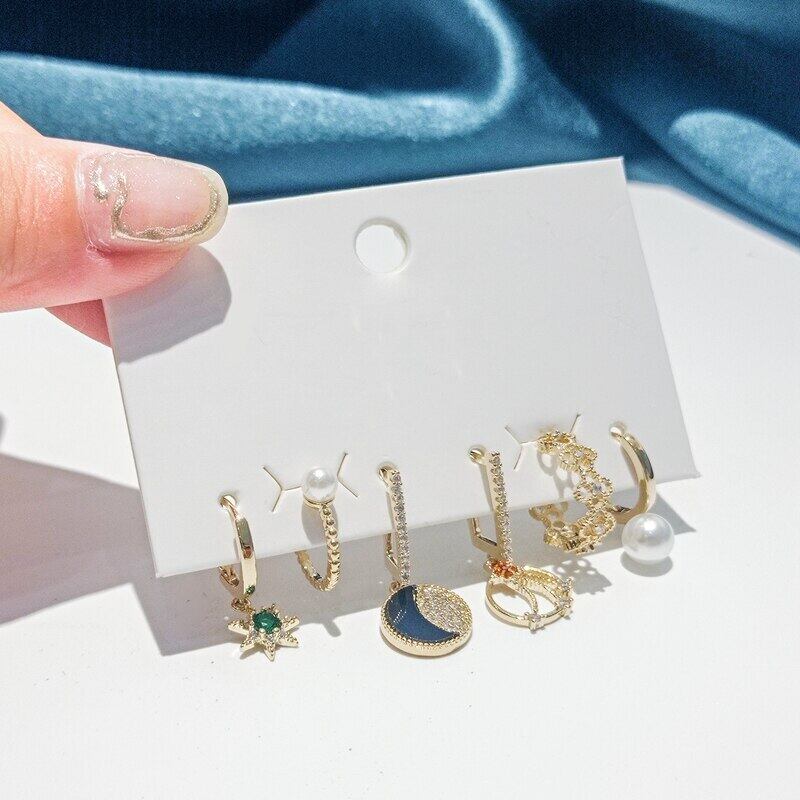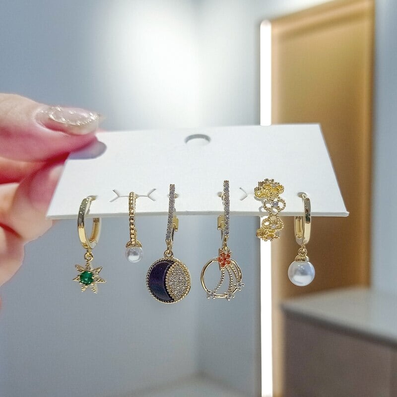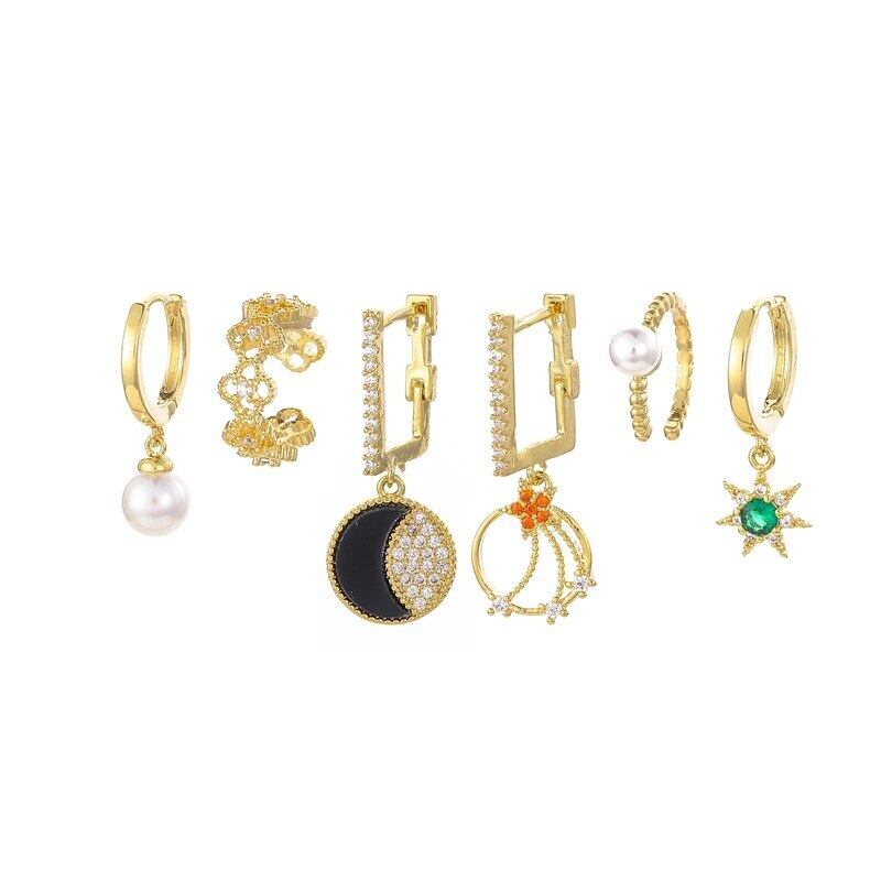 送料無料 ANENJERYシルバーカラージルコンムーンスターペンダントフープピアスレディースパールクリップ6ピースピアスセット イヤリング 真珠 リング 指輪 銀 アクセサリー AE165515684223550