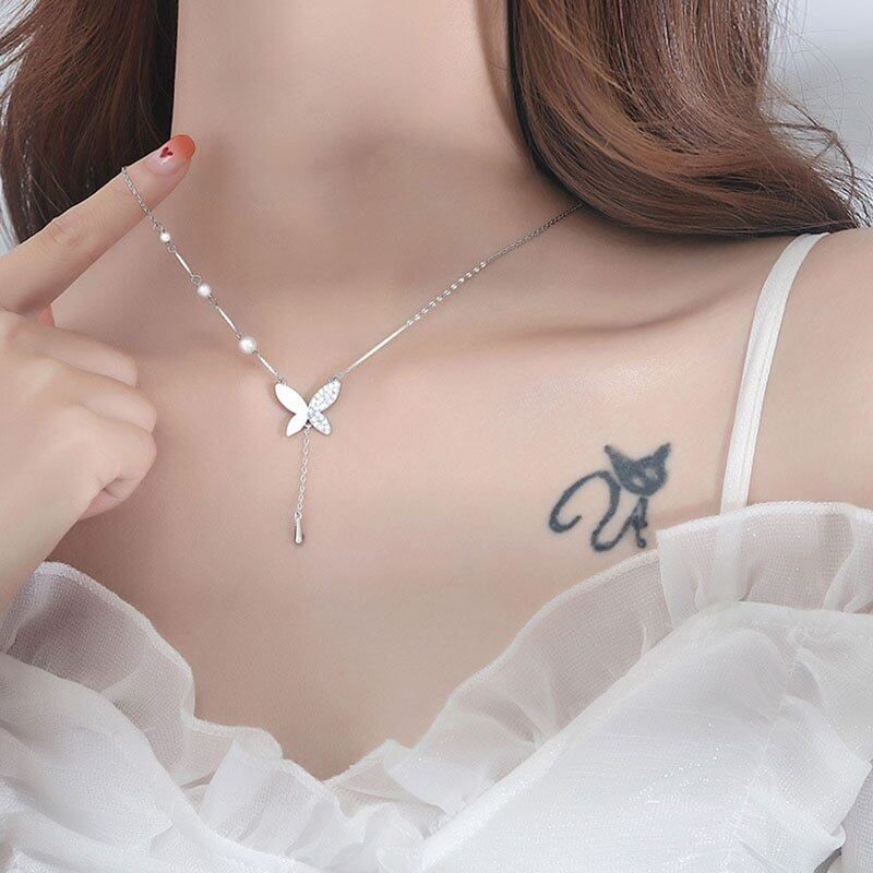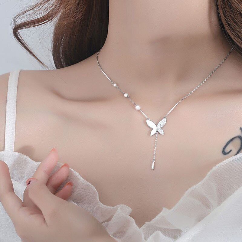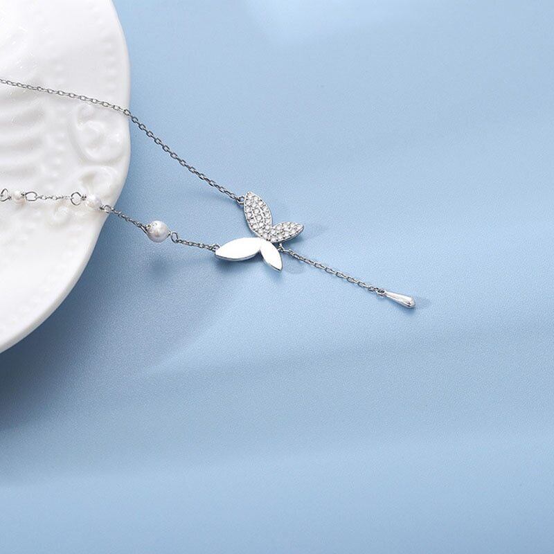 送料無料 ANENJERYシルバーカラースマイルバタフライネックレスレディースライトラグジュアリー鎖骨チェーンシンプルパールネックレス レース 真珠 銀 アクセサリー AE16553755512741