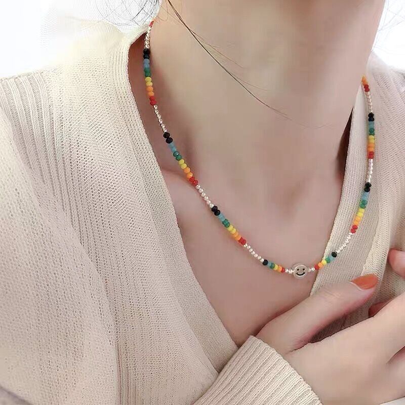 送料無料 ANENJERYシルバーカラー笑顔カラフルビーズネックレスレディーススタック鎖骨チェーンジュエリー レース 銀 アクセサリー AE165582046251668