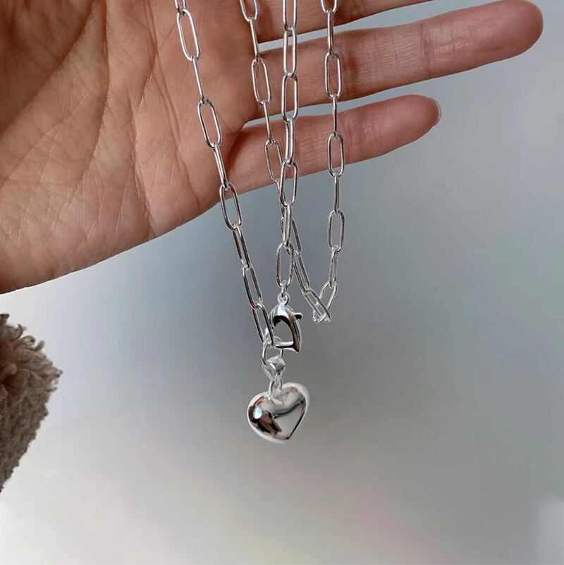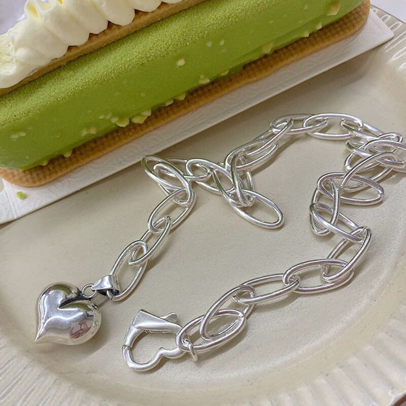 送料無料 ANENJERYシルバーカラーカッパーハートペンダント太いチェーンネックレスブレスレット女性ピーチハートクールジュエリーセット レース 銀 アクセサリー AE165535358691027