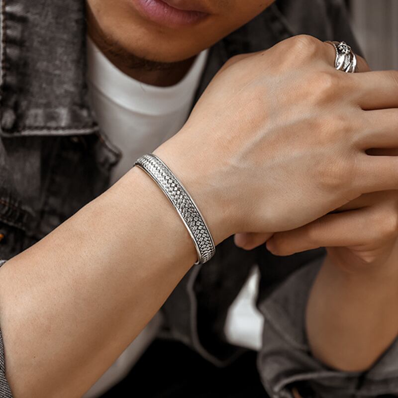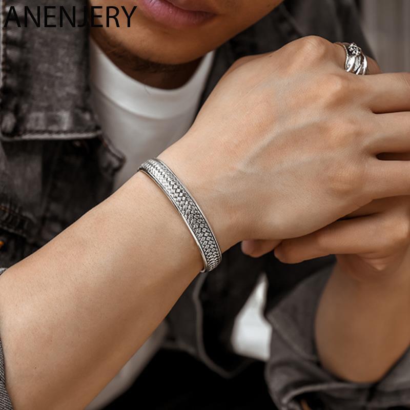 送料無料 ANENJERYシルバーカラー銅波パターン経典カフブレスレット&バングル女性男性レトロハンドジュエリー 銀 アクセサリー AE165550113032759