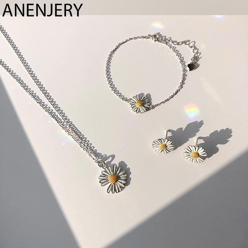送料無料 ANENJERYシルバーカラーカッパーデイジーサンフラワーネックレスブレスレットイヤリングセットレディースシンプル人気アクセサリー レース フラワーデザイン 銀 アクセサリー AE165535404638547