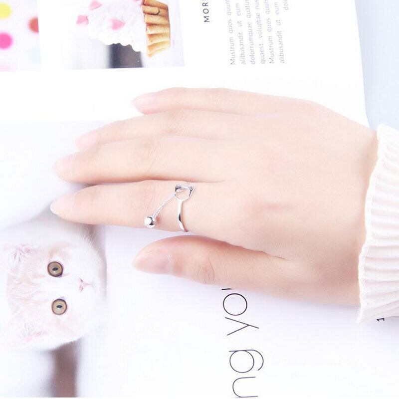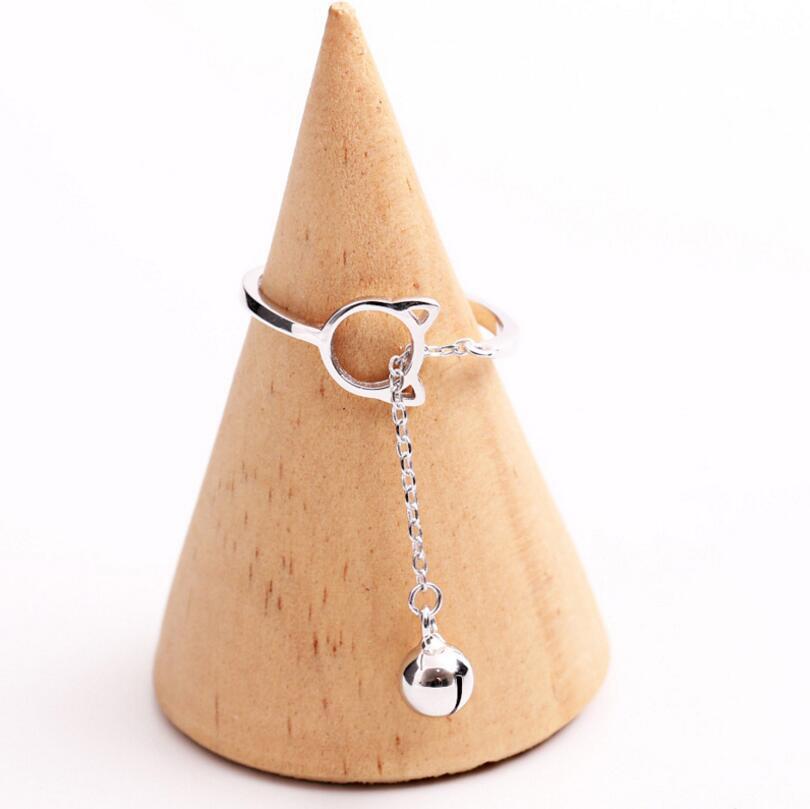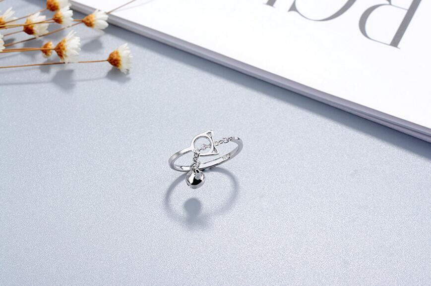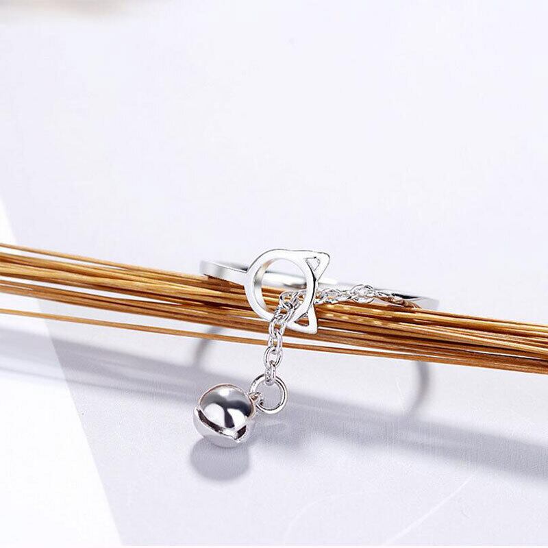 送料無料 ANENJERYシルバーカラーホローかわいい猫Telオープニングリングチェーン付きベルペンダントガールズジュエリーギフトS-R279 大人ガーリー スウィート キュート カジュアル 指輪 銀 アクセサリー AE165549570319077