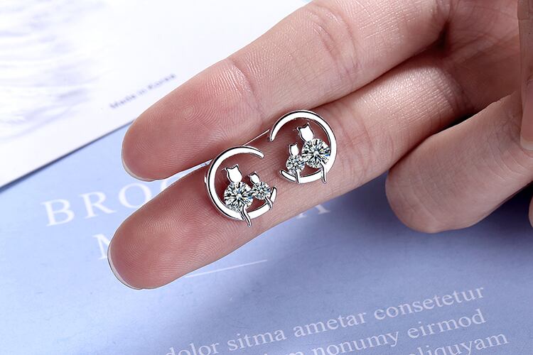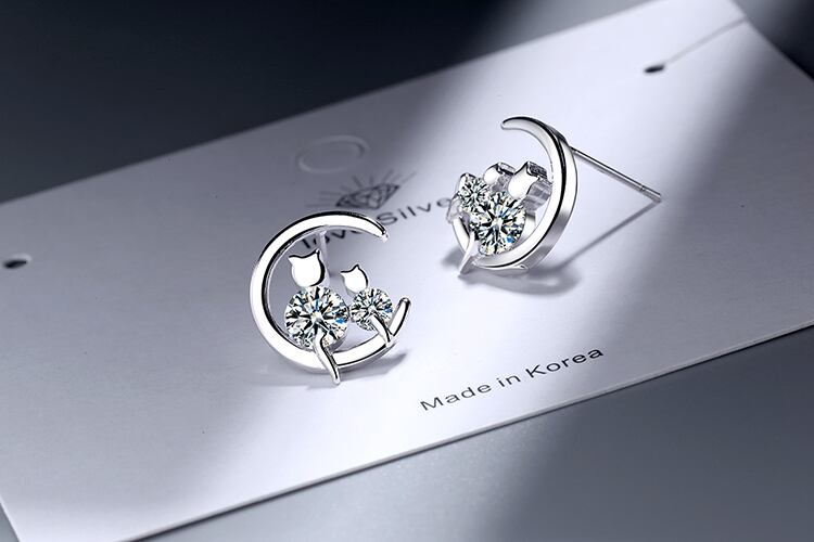 送料無料 ANENJERYシルバーカラームーンキャットスタッドピアスシャイニージルコンイヤースタッドピアスレディースガールギフトS-E910 イヤリング リング 指輪 銀 アクセサリー AE165518482466434