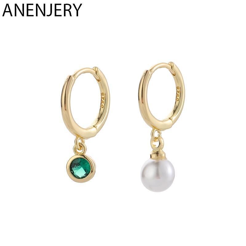 送料無料 ANENJERYシルバーカラーグリーンジルコンパール非対称フープイヤリングイヤージュエリーウィメンズパーティーギフトS-E1128 真珠 銀 アクセサリー AE165521593153862