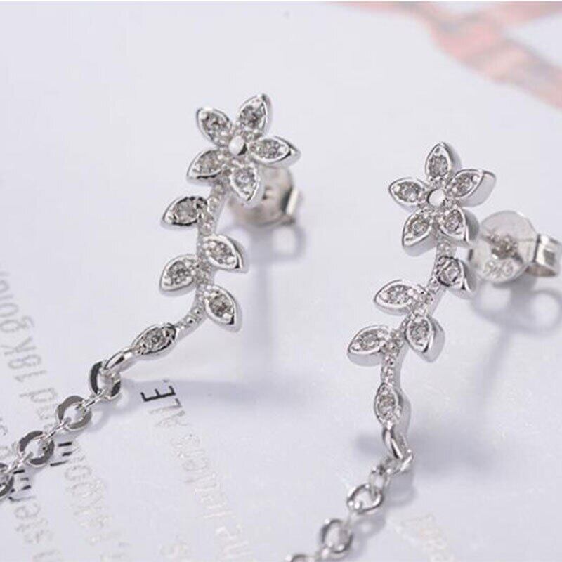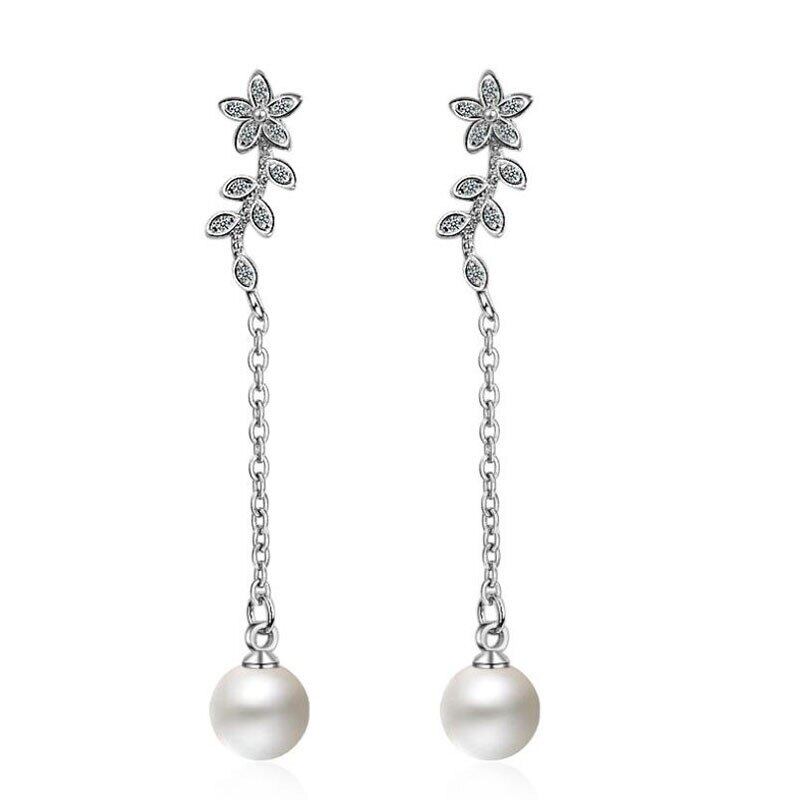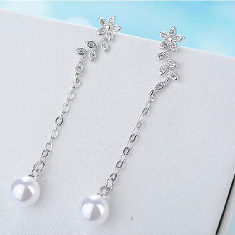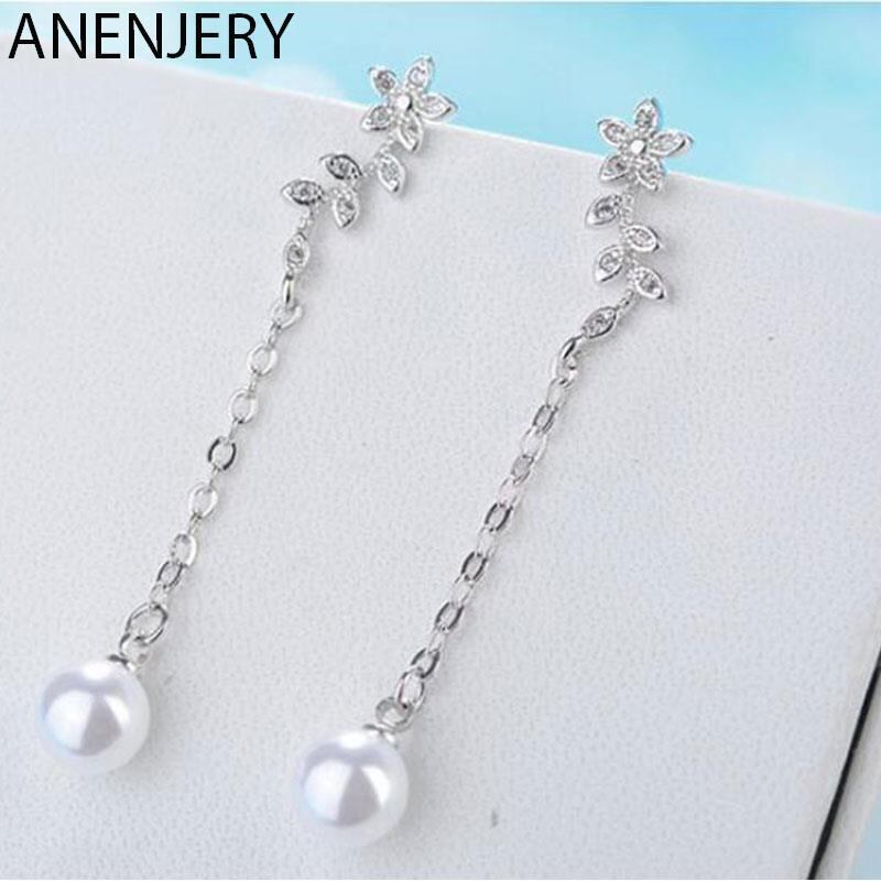 送料無料 ANENJERYシルバーカラーツリーリーブシェイプロングテルイヤリング、シミュレートされたパールペンダントジルコンジュエリー女性S-E551 真珠 指輪 銀 人工 アクセサリー AE165547007869715