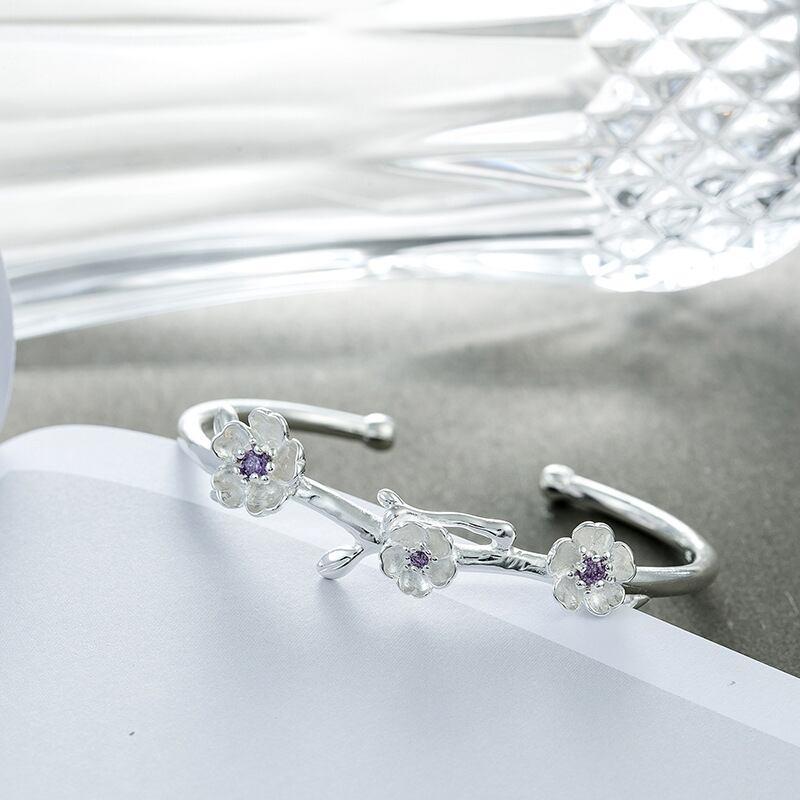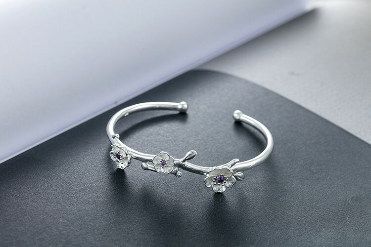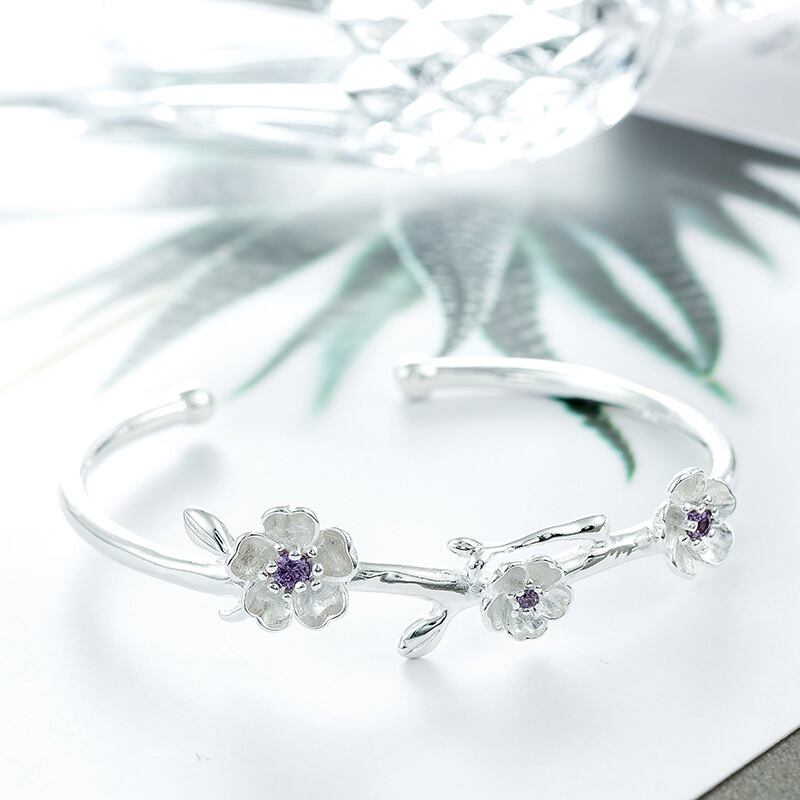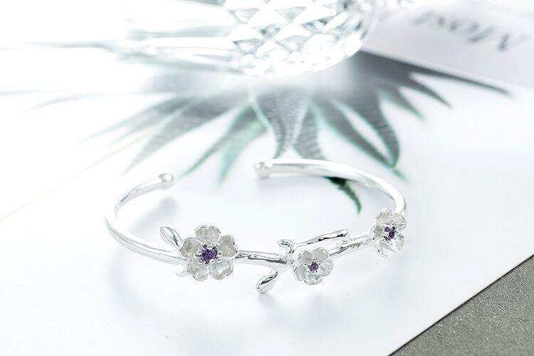 送料無料 ANENJERYシルバーカラー可憐な桜バングルブレスレットとパープルジルコンジュエリーオープンカフバングルS-B279 銀 アクセサリー AE165543963071658