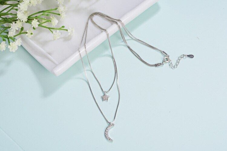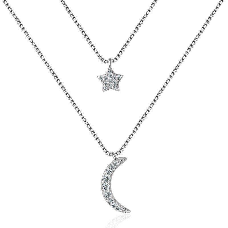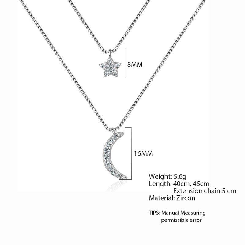 送料無料 ANENJERYシルバーカラーダブルレイヤードムーンスター鎖骨チェーンネックレスマイクロ舗装ジルコンジュエリーレディースガールS-N389 レッド レース 銀 アクセサリー AE165547677508485