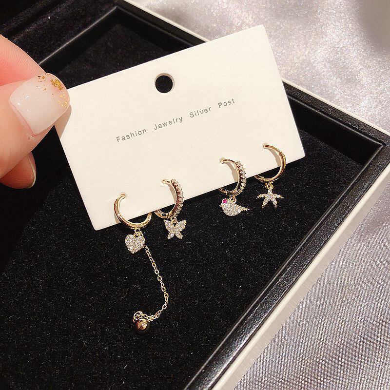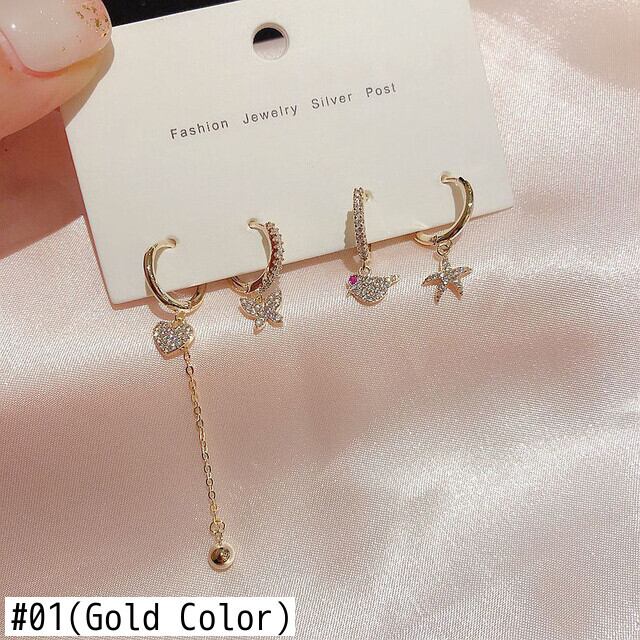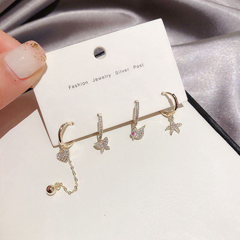 送料無料 ハートバタフライバードスターフィッシュフープピアスセット象眼細工のキュービックジルコン4ピースピアスセット女性S-E1117 イヤリング リング 指輪 アクセサリー AE165558804393205