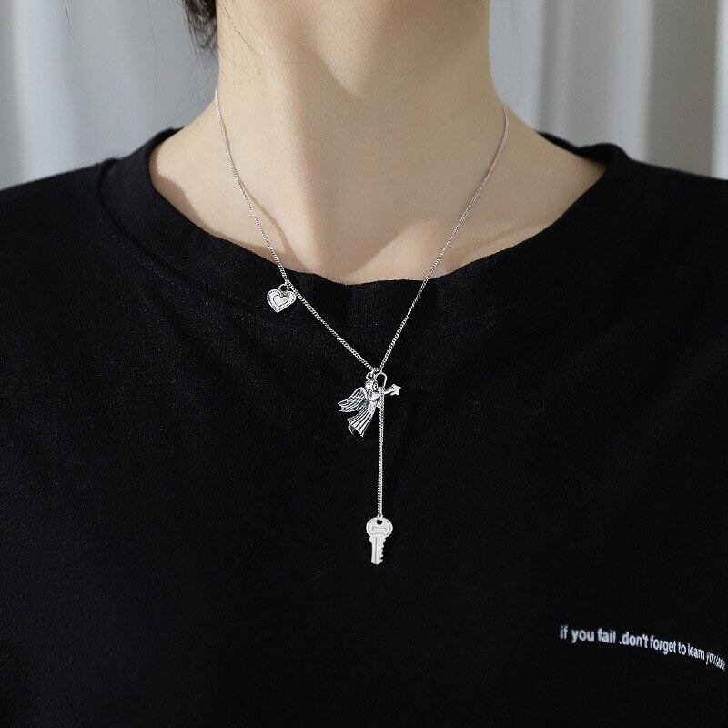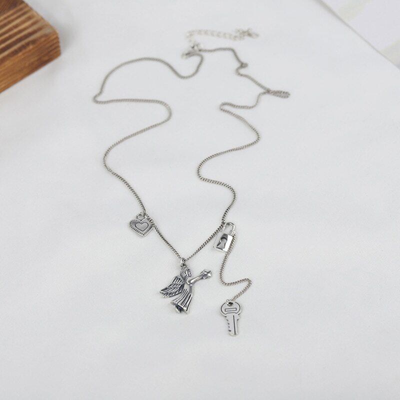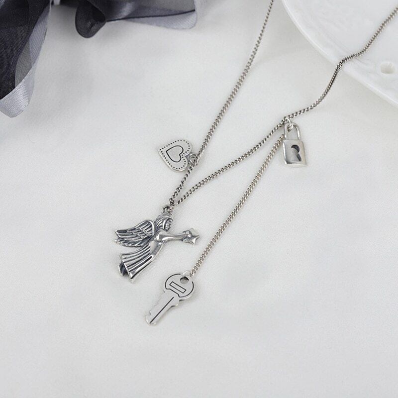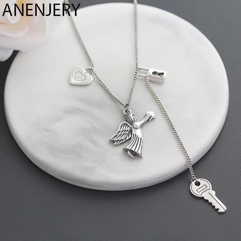 送料無料 ANENJERYシルバーカラーヴィンテージハンドメイドラブハートエンジェルキーロックタイシルバーネックレスレディースジュエラーギフトS-N652 レース 銀 ビンテージ アクセサリー AE165525761017279