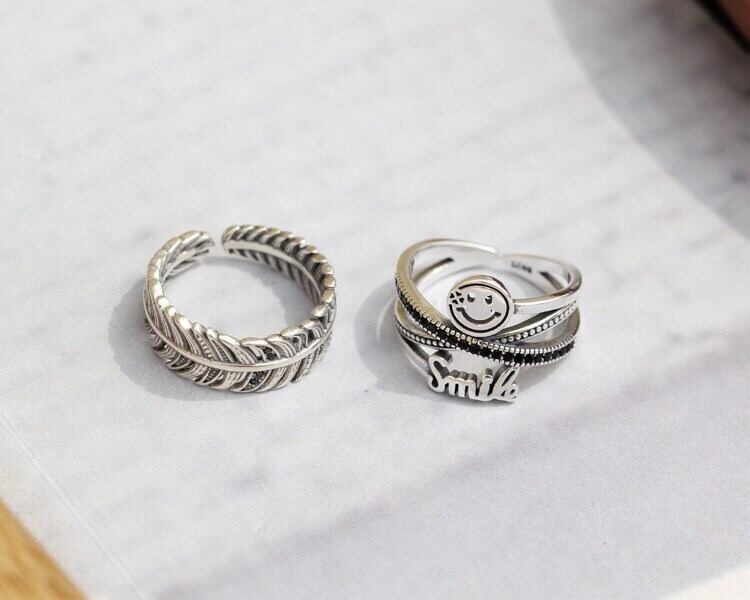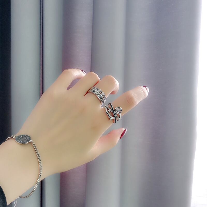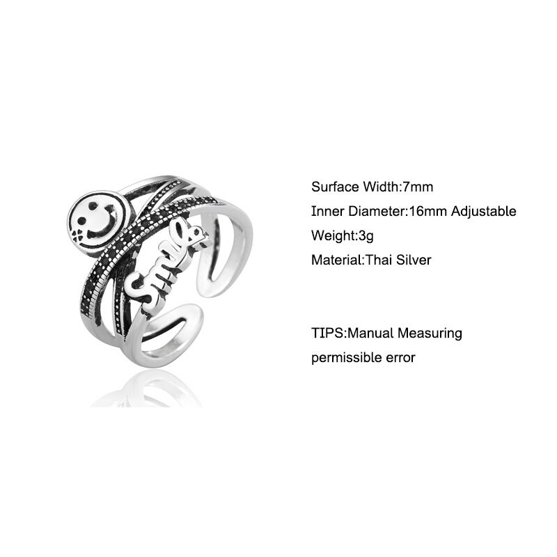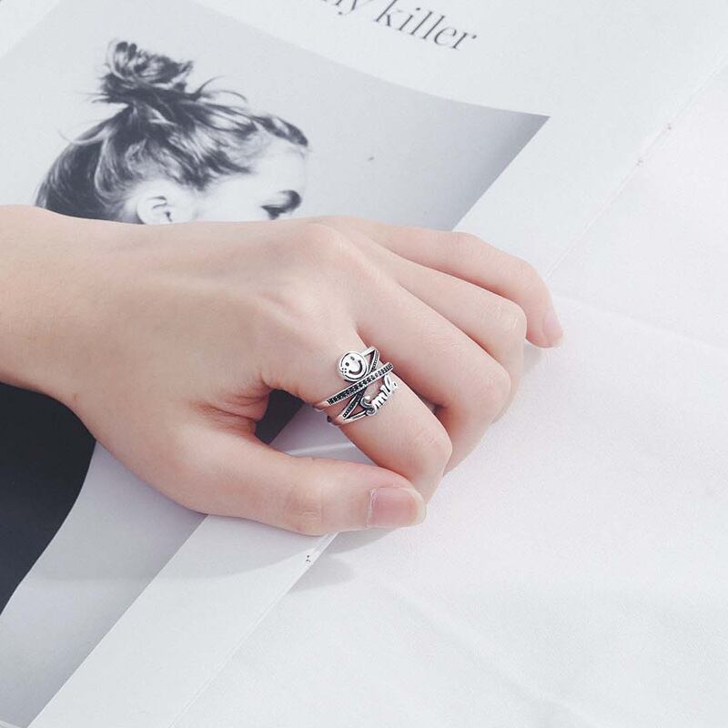 送料無料 ANENJERYシルバーカラーハッピースマイルフェイスレタータイシルバーリングミューティレイヤークロスブラックストーンオープンリングギフトS-R586 指輪 銀 アクセサリー AE165585602561703