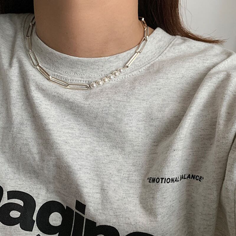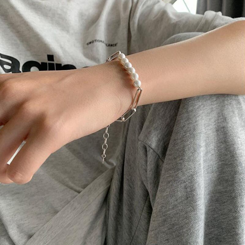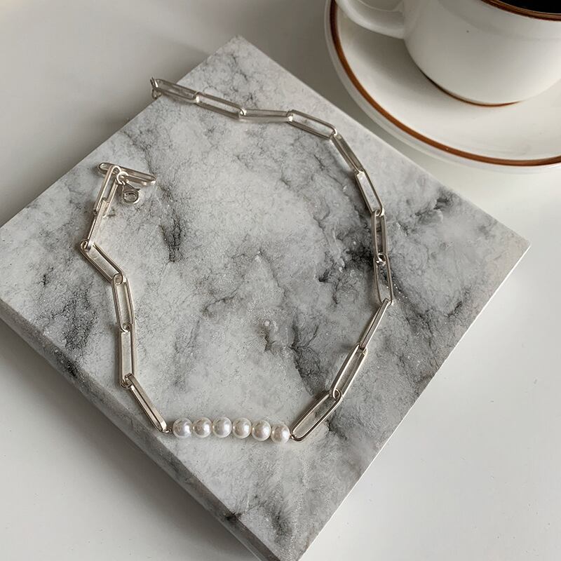 送料無料 ANENJERYシルバーカラー銅幾何学パールチェーンネックレスブレスレットセット女性個性アクセサリー レース 真珠 銀 アクセサリー AE165546714712796
