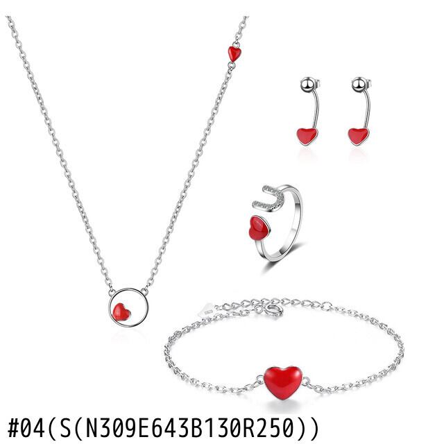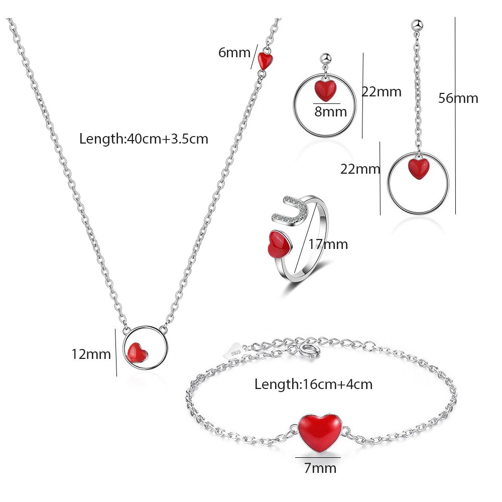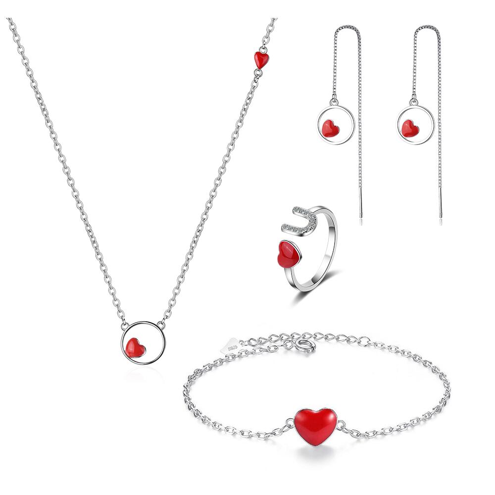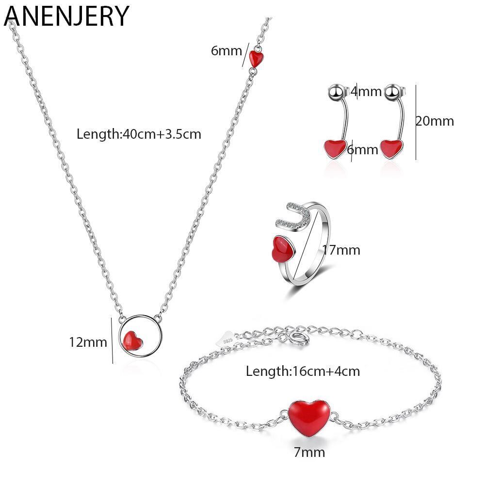 送料無料 ANENJERYシルバーカラーデリケートレッドラブハートジュエリーセットネックレスイヤリングリングブレスレットジュエリーレディースガールズパーティーギフト レース 指輪 銀 アクセサリー AE165515497319700