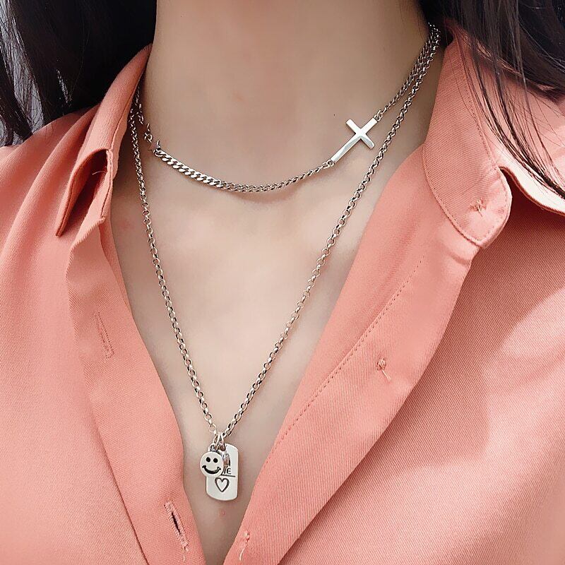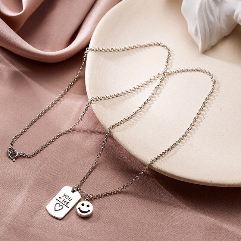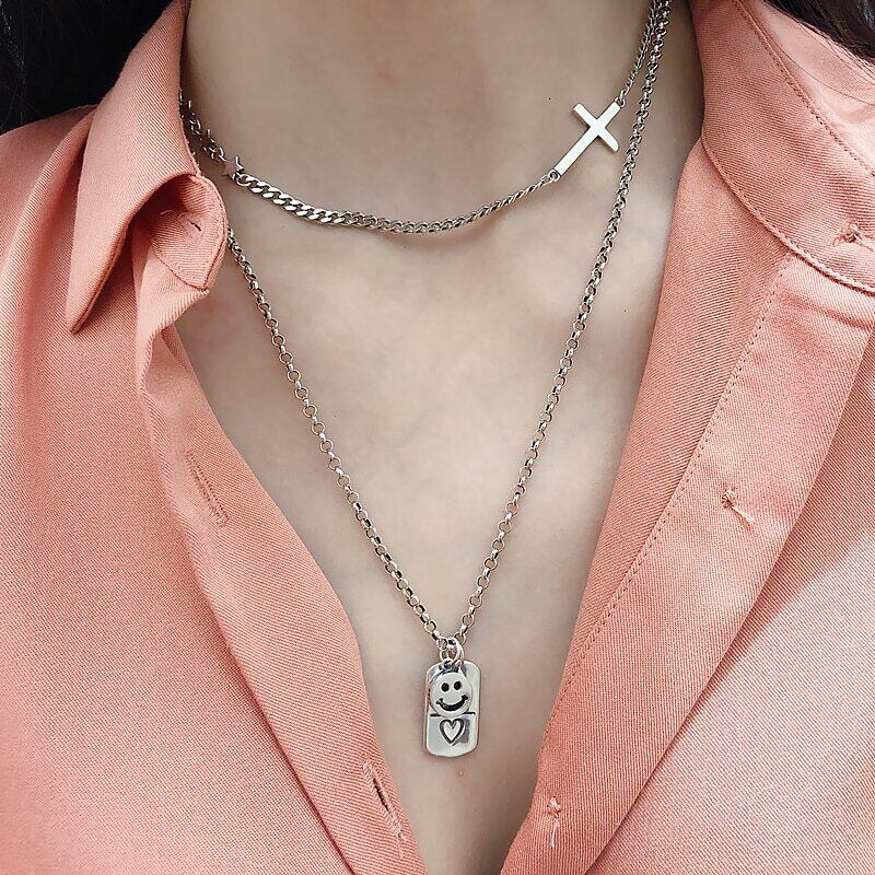 送料無料 ANENJERYシルバーカラースクエアレタースマイルフェイスタイシルバーネックレスクロスペンダントクラビクルチェーンジュエリーレディースS-N628 レース 銀 スクウェア アクセサリー AE16556217874454