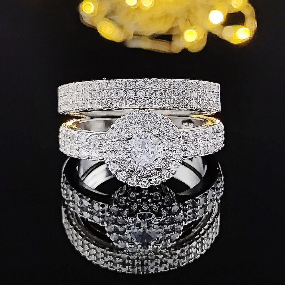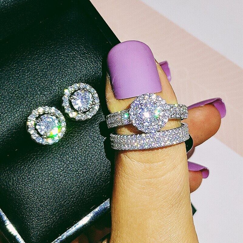 送料無料 2ピースパックシルバーカラー花嫁ジュエリーセットハロー婚約指輪ラウンドスタッドピアスウェディングギフトパーティーJ5554 イヤリング リング 銀 アクセサリー AE00116679744656397