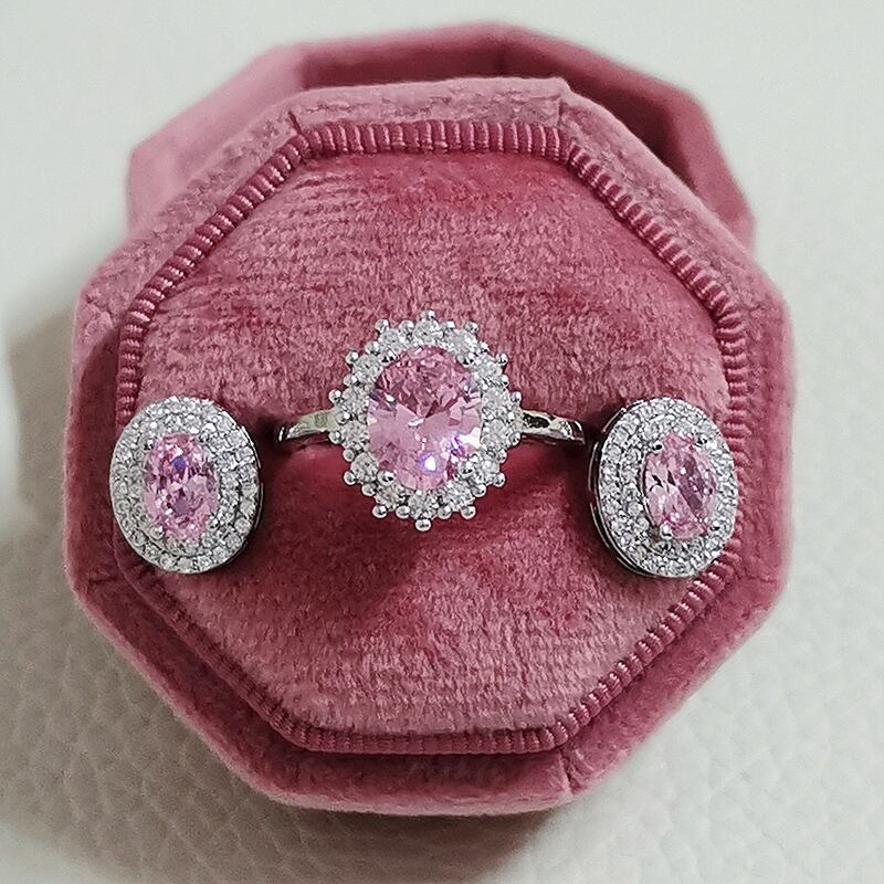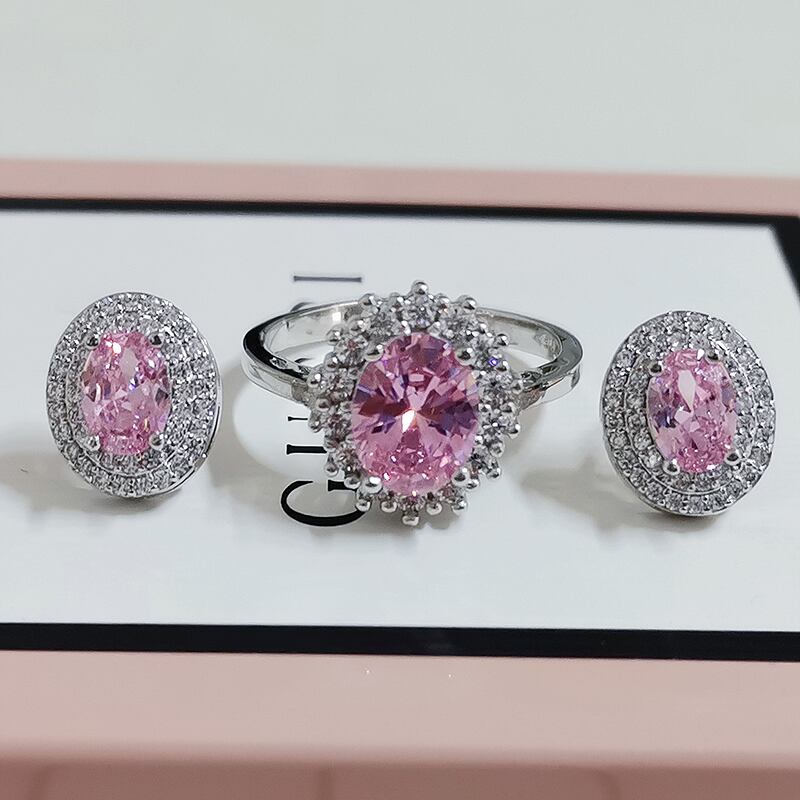 送料無料 2ピースパックシルバーカラー花嫁クッションカットジルコンジュエリーセット婚約指輪スタッドピアス女性ギフトJ4944-ピンク イヤリング リング 銀 アクセサリー AE0011668925529190
