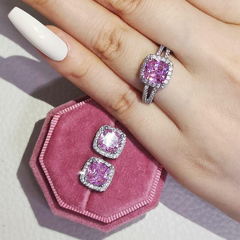 送料無料 2ピースパックシルバーカラー花嫁ジュエリーセットハロー婚約指輪ラウンドスタッドピアスウェディングJ4934-ピンク イヤリング リング 銀 アクセサリー AE0011664140863912