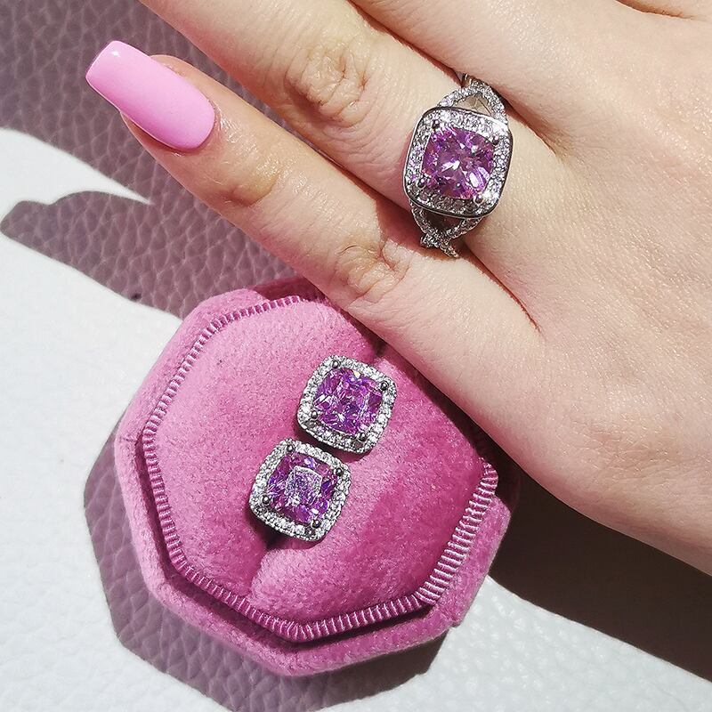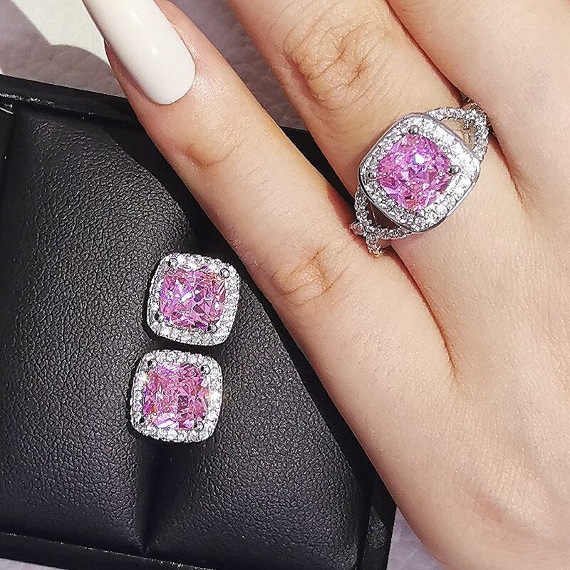 送料無料 2ピースパックシルバーカラー花嫁ジュエリーセットハロー婚約指輪ラウンドスタッドピアスウェディングギフトクリスマスJ4936-ピンク イヤリング リング 銀 アクセサリー AE0011663227325156