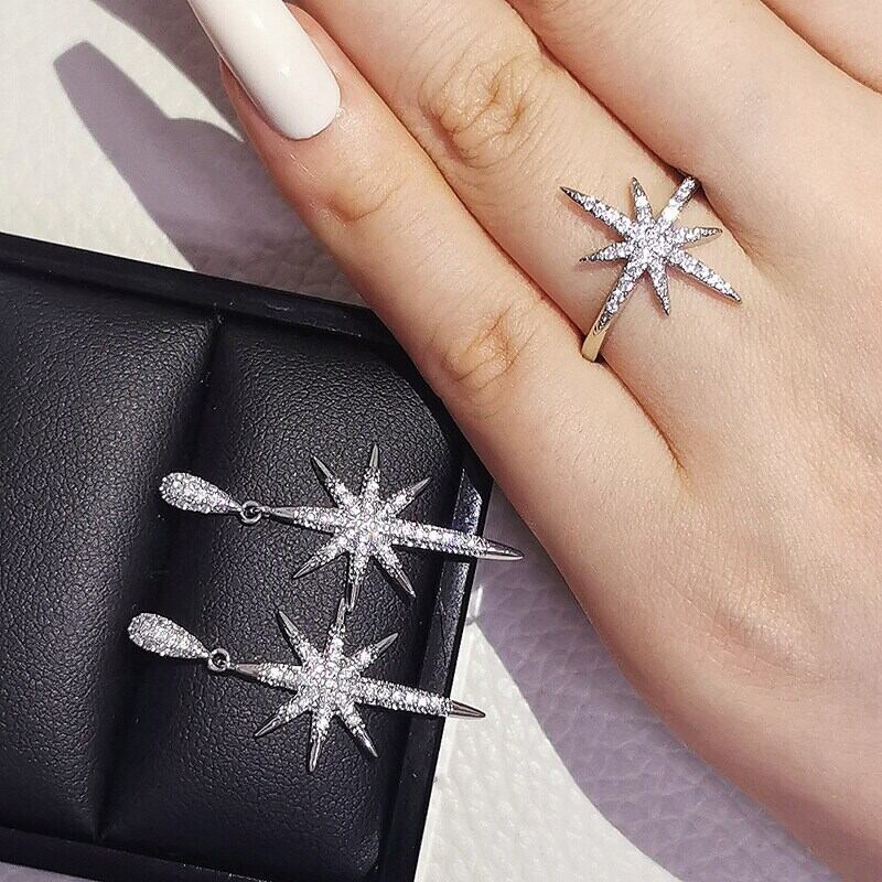 送料無料 2ピースパックシルバーカラー花嫁スターカットジルコンジュエリーセット婚約指輪スタッドピアス女性ギフトJ6033 イヤリング リング 銀 アクセサリー AE00116666235356458